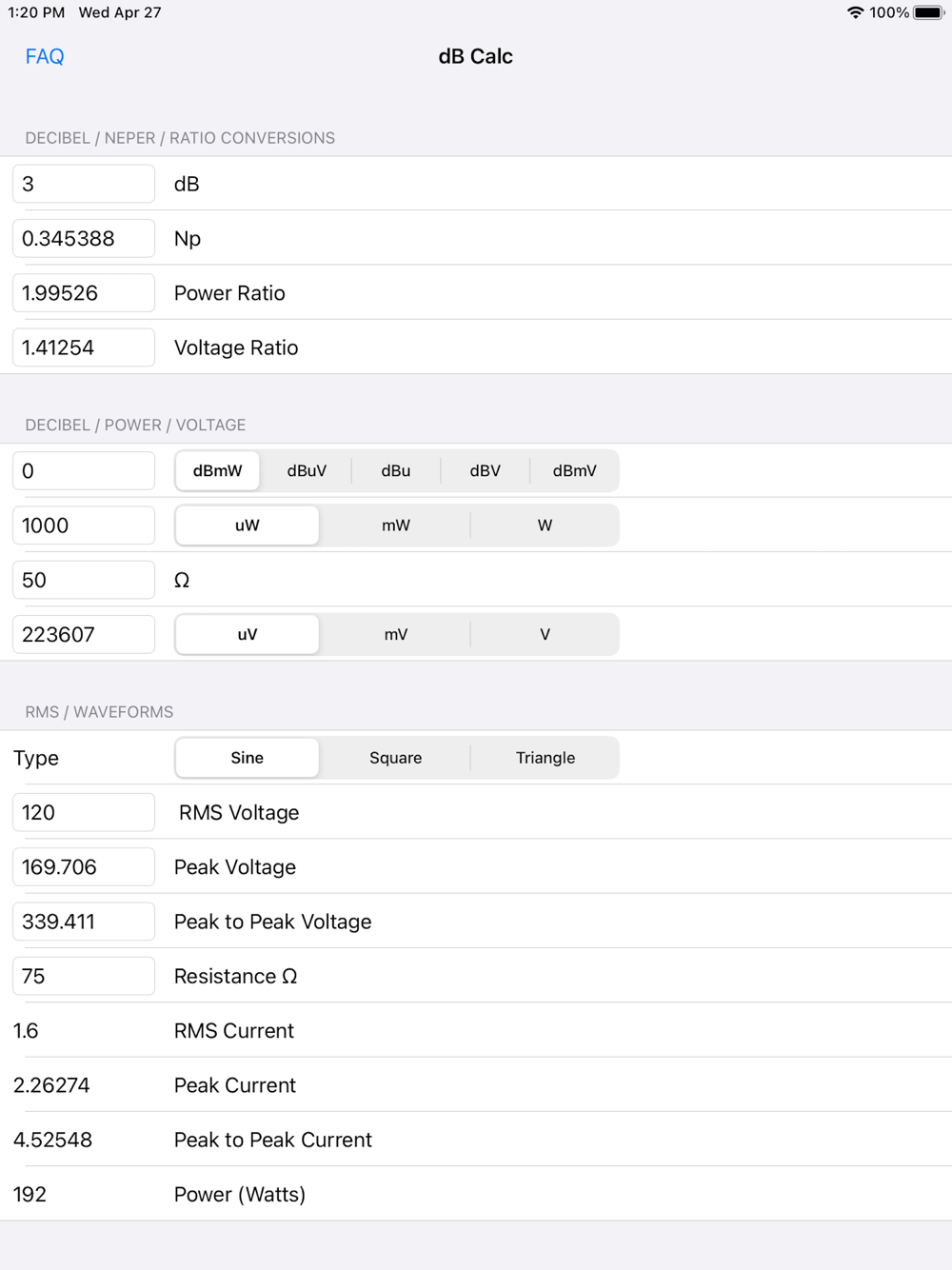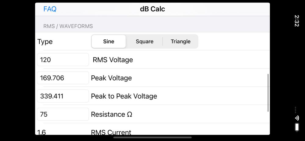 Conversion between rms, peak, peak-peak voltage and current values for a user entered resistance. Sine, square, and triangle waveforms are supported.