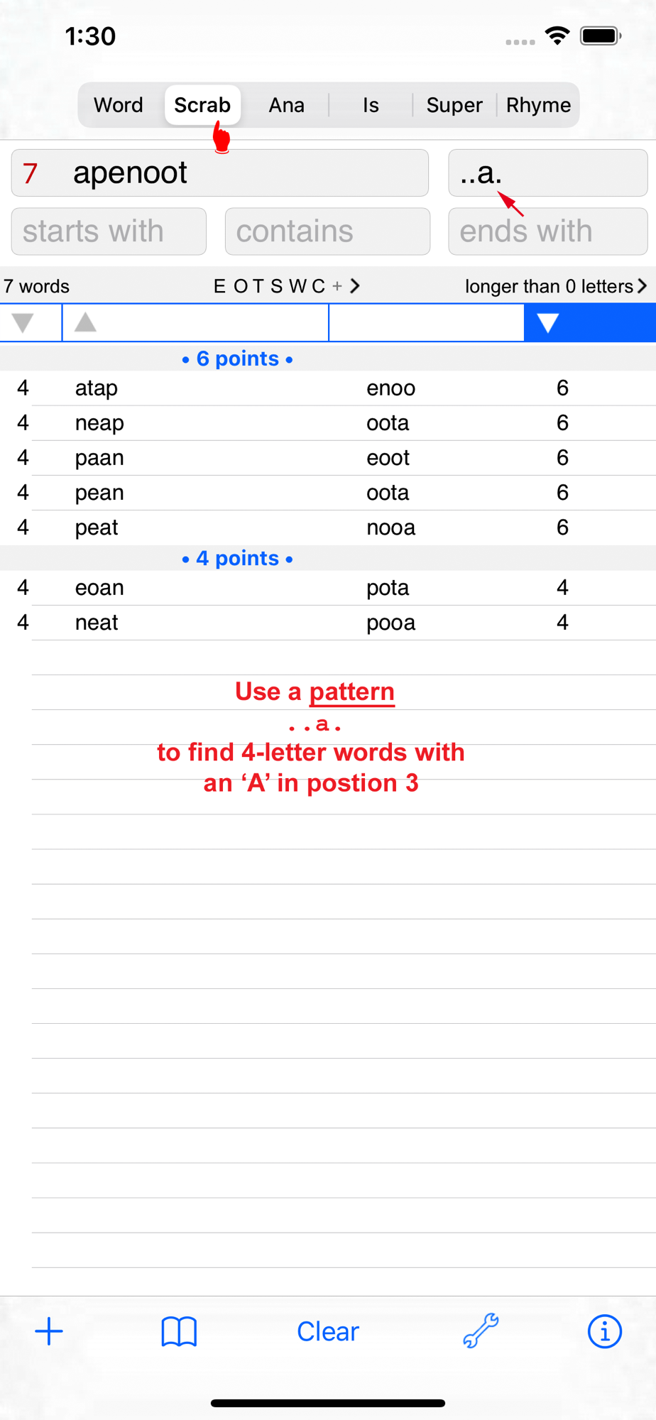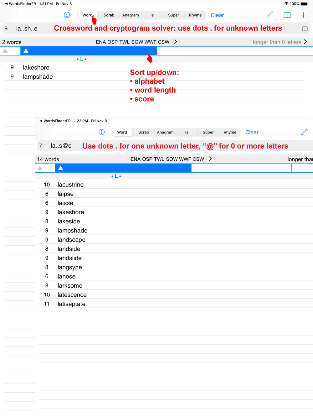 Solve crossword puzzles, cryptograms, Wordfeud, Scrabble™, or just check your spelling. Sort by word length, alphabet or score to find not just the longest words, but the words with the highest score!