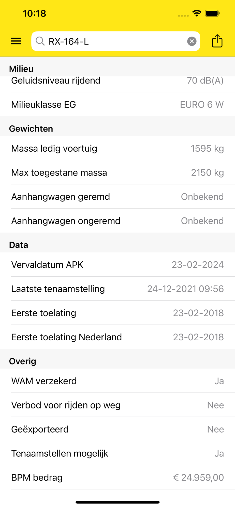 De gegevens die je onder andere te zien krijgt: Merk, Type, Kleur, Zitplaatsen, Aantal eigenaren, Logische tellerstand, Nieuwprijs, Gestolen, Cilinders, Cilinderinhoud, Vermogen in pk en kW, Brandstof, , Brandstofverbruik WLTP en NEDC, Actieradius , CO2 uitstoot, Geluidsniveau, Milieuklasse, Massa ledig voertuig, Maximaal toegestane massa, Maximaal te trekken massa ongeremd en geremd, APK gegevens over; de Vervaldatum, Laatste tenaamstelling, Eerste toelating, Eerste afgifte Nederland, Wacht op keuren, WAM verzekerd, Geëxporteerd en de BPM.