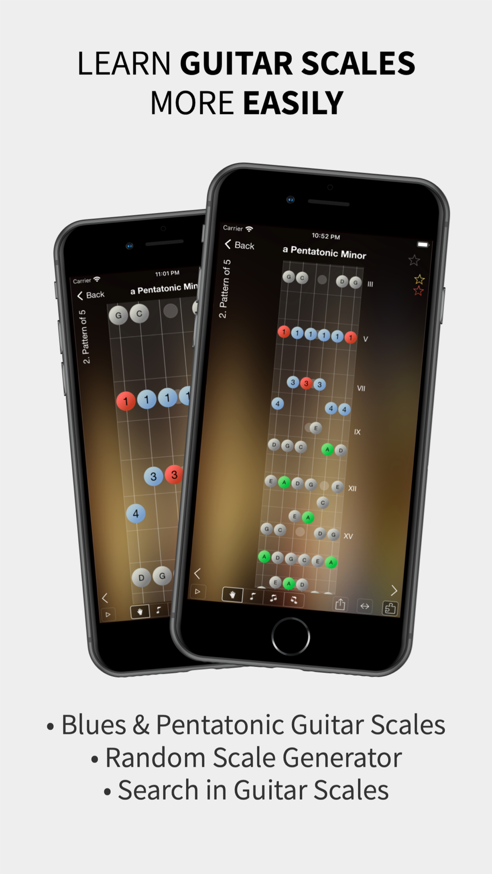Instead of teaching complicated charts, Star Scales Pro app quickly helps you to master scale patterns, improve speed and accuracy, and build up muscle memory at the same time. In Star Scales Pro app each scale comes with fingering and note names in all positions on the fretboard, making it easy to master a pattern.