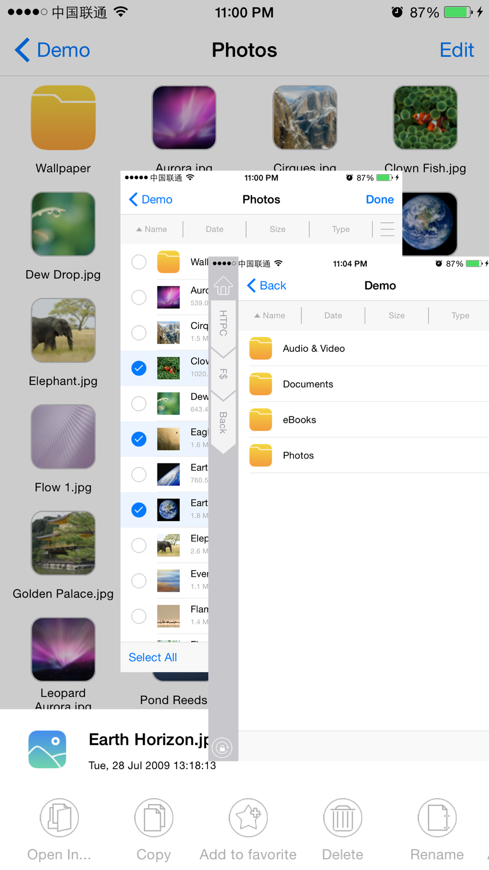 With iExplorer (for iPhone) , you can manage/view files on your remote servers (Windows sharing server/FTP server/WebDAV server/Cloud server ...) in home, office and anywhere. iExplorer also is a good eBook reader, media player, photo viewer, and work assistant. You can read CHM, ePub, PDF and large text/PDB files with outline/bookmark/annotation support, play musics and movies without copying them to your device, view large photos on your PC/NAS and share to friends, edit spreadsheets on your Google Docs and save them as different formats, print any viewable documents.
