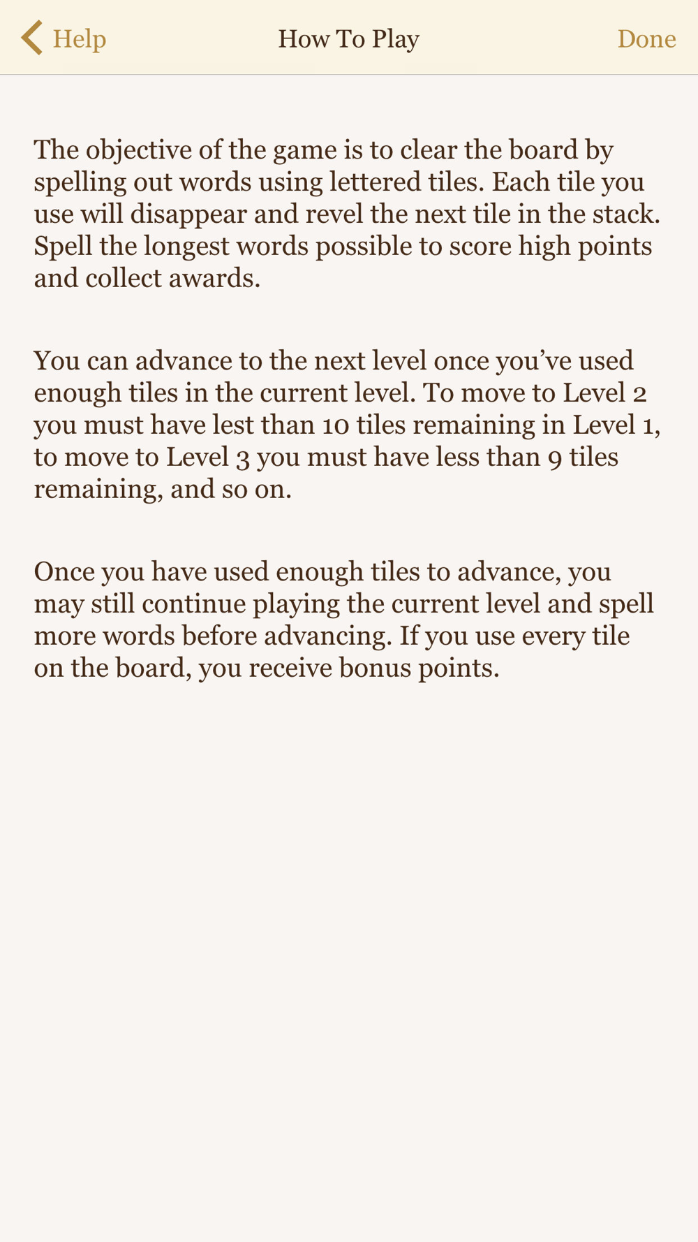 Test your vocabulary in a game where size matters. Use layers of lettered tiles to create the longest words possible and earn hefty points. Strategy is key to achieving high scores and awards. One wrong move can cost you major points. Choose the game mode that suits your skill level and you are on your way to becoming a Wordologist.