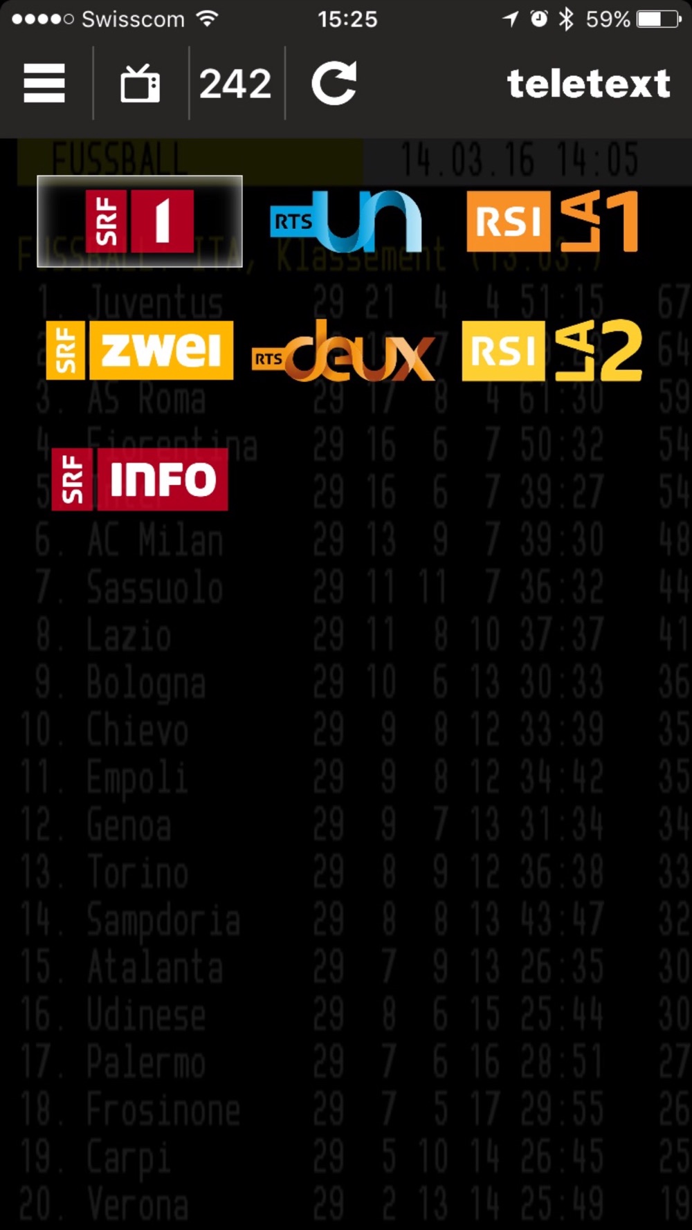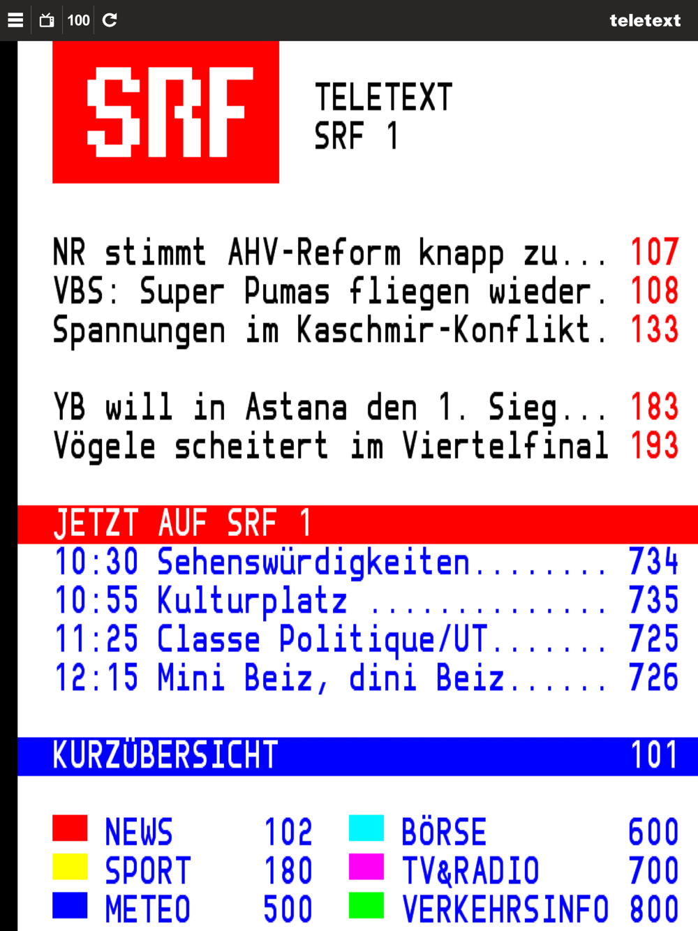 Die Navigation erfolgt über die bekannten Seitenzahlen oder per Rubrikenverzeichnis. Verpassen Sie also keine News auf Seite 100 und verfolgen Sie die Ergebnisse Ihrer Lieblings-Sportart ab Seite 180. Zudem gibt es noch viel mehr im TELETEXT zu entdecken!