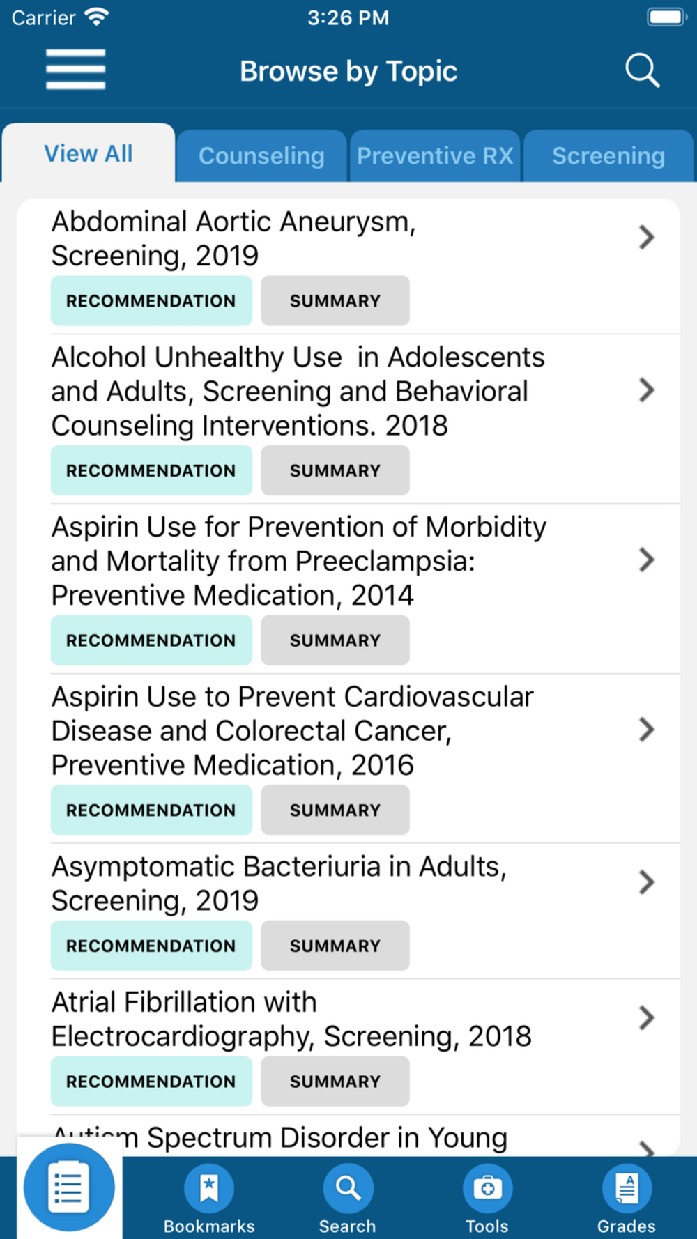 The Prevention TaskForce application was developed to assist primary care clinicians identify the screening, counseling, and preventive medication services that are appropriate for their patients. The Prevention TaskForce information is based on the current recommendations of the U.S. Preventive Services Task Force (USPSTF) and can be searched by specific patient characteristics, such as age, sex/gender, and selected behavioral risk factors. When using this tool please read the specific recommendation to determine if the preventive service is appropriate for your patient. This tool is not meant to replace clinical judgment and individualized patient care.