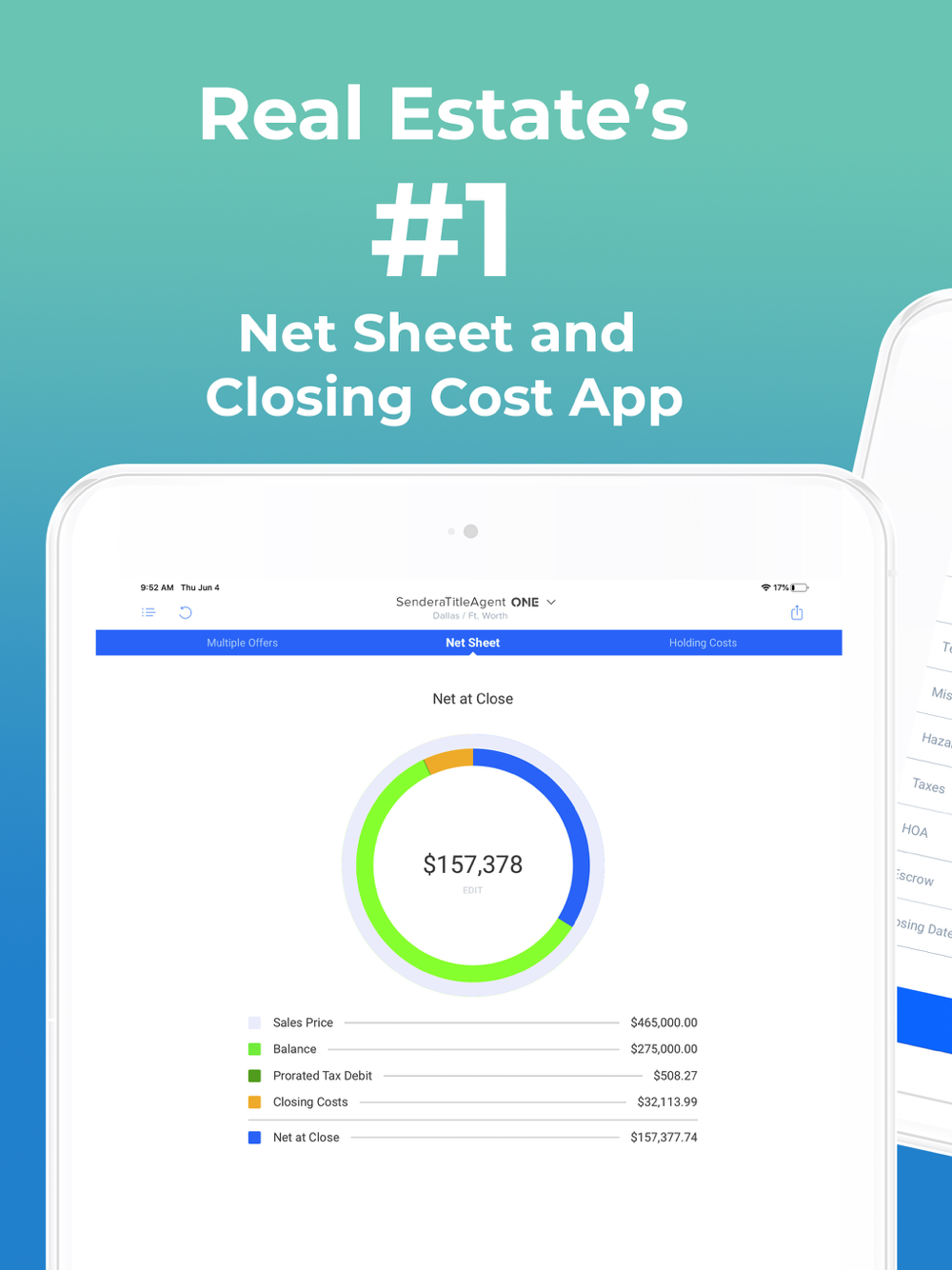 SenderaTitleAgent ONE is a city/county specific closing cost app that comes preloaded with calculations and closing costs for Real Estate professionals. Generate quick and professional seller net sheets and buyer estimates for your clients in just seconds. SenderaTitleAgent ONE is jam-packed with features that are sure to wow your clients!