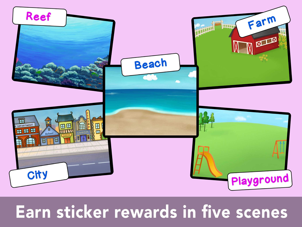 • 6 different sticker reward scenes: beach, underwater reef, pirate cove, city, farm and playground