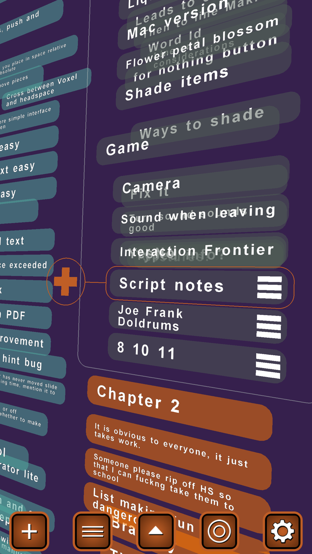 Big ideas, great thoughts, even boring to-do lists are more fun when they're in THREE DIMENSIONS. Create groups of related thoughts and position them in space. Rotate, pan, and zoom your view with finger gestures. Go all David Lynch and get DEEP with yourself.