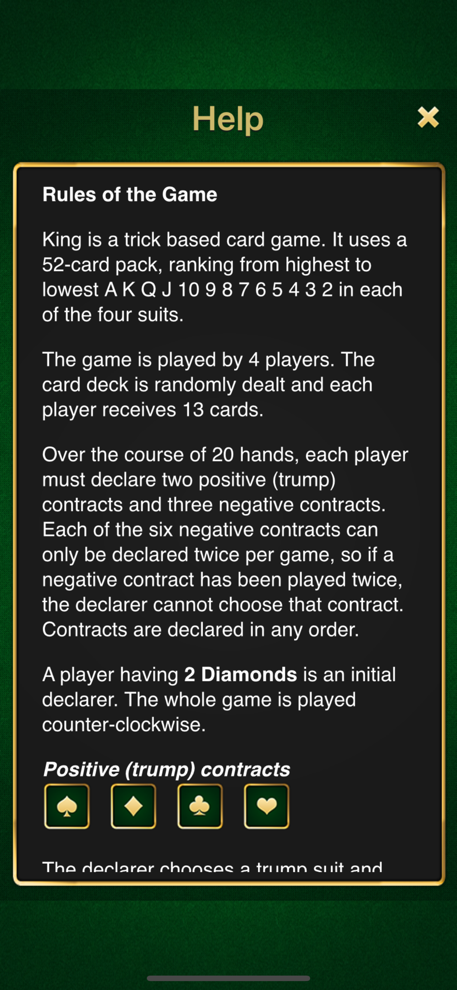 King is a trick-taking card game played by four players. The game is popular in many countries and is similar to the Barbu (Tafferan) game. It uses a standard 52-card pack, ranking from highest to lowest A K Q J 10 9 8 7 6 5 4 3 2 in each of the four suits.