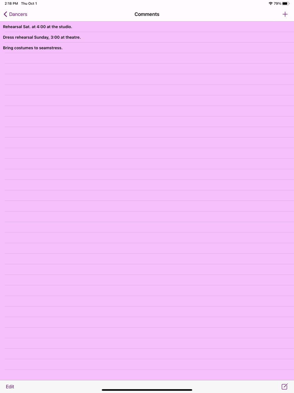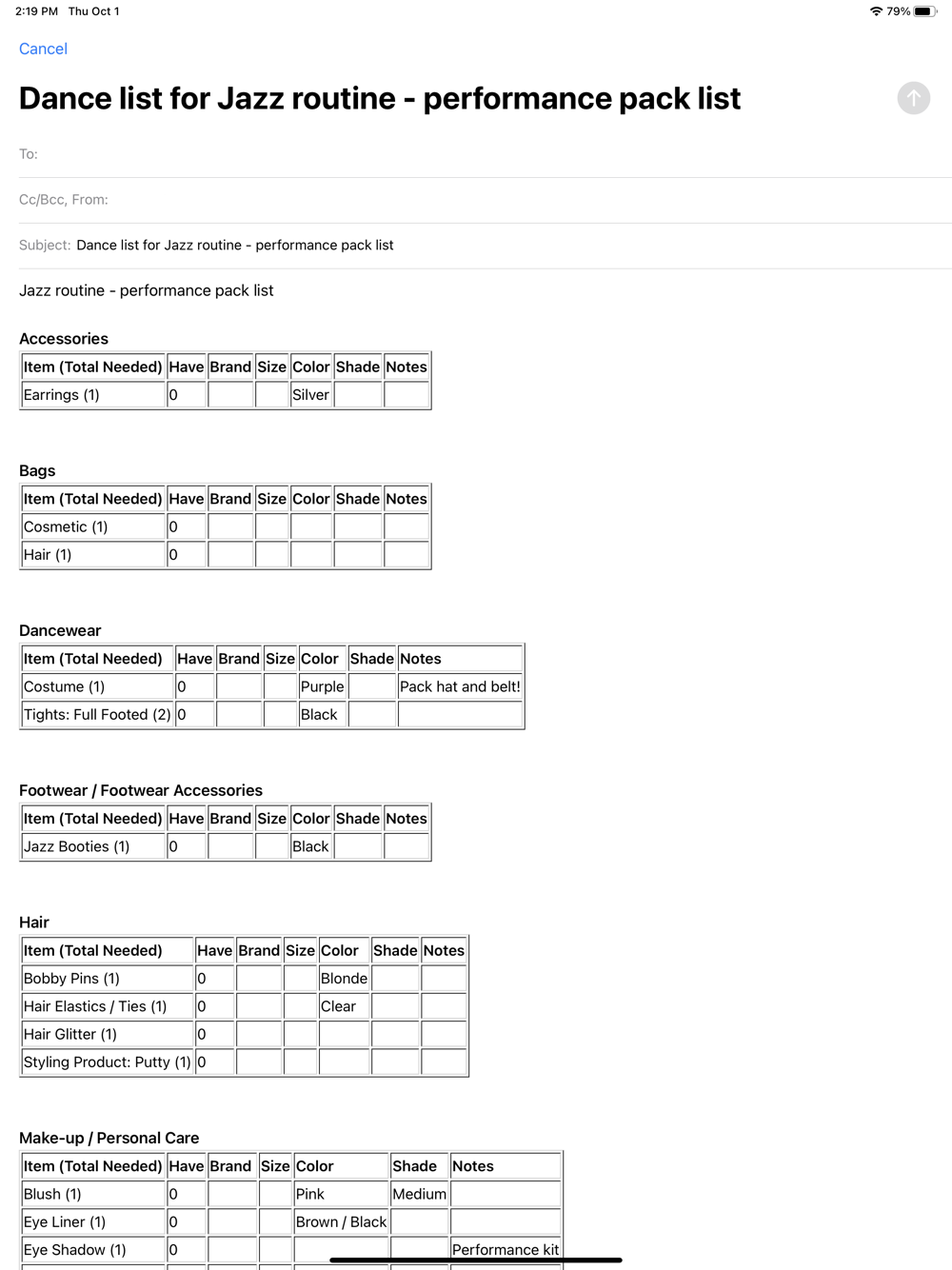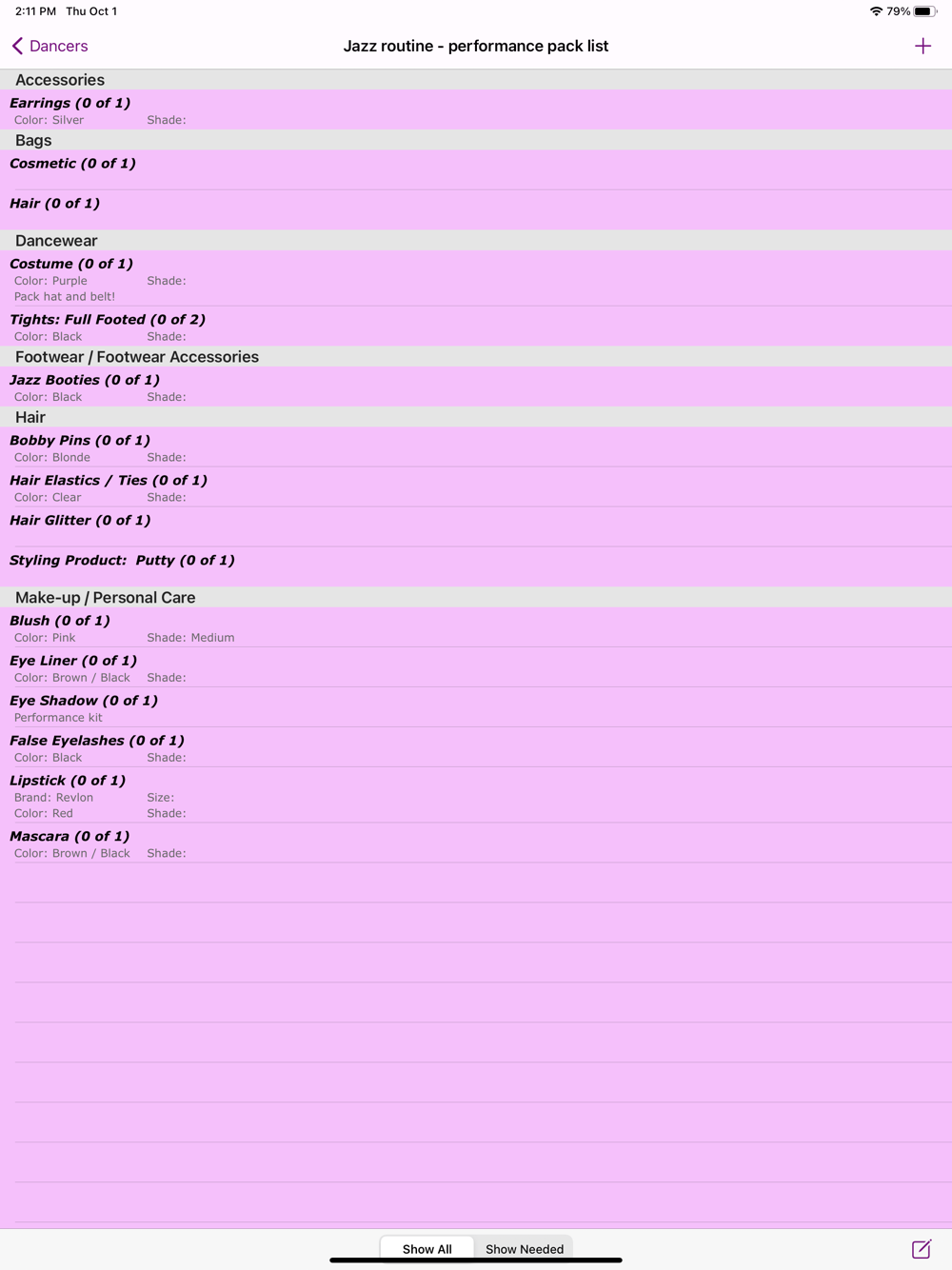 - Create list by dancer or even performance routines to help organize items