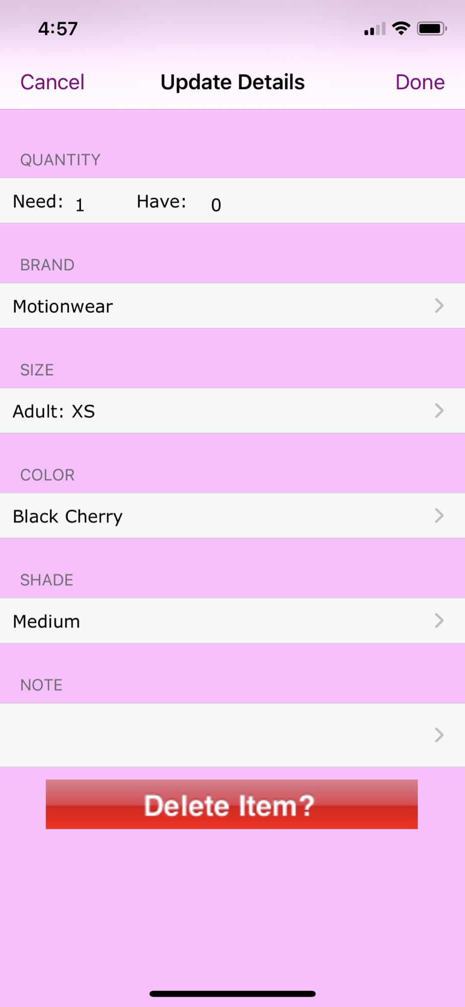 - Choose brand, size, color, and shade for each item using preset items from the database – or you can add your own!