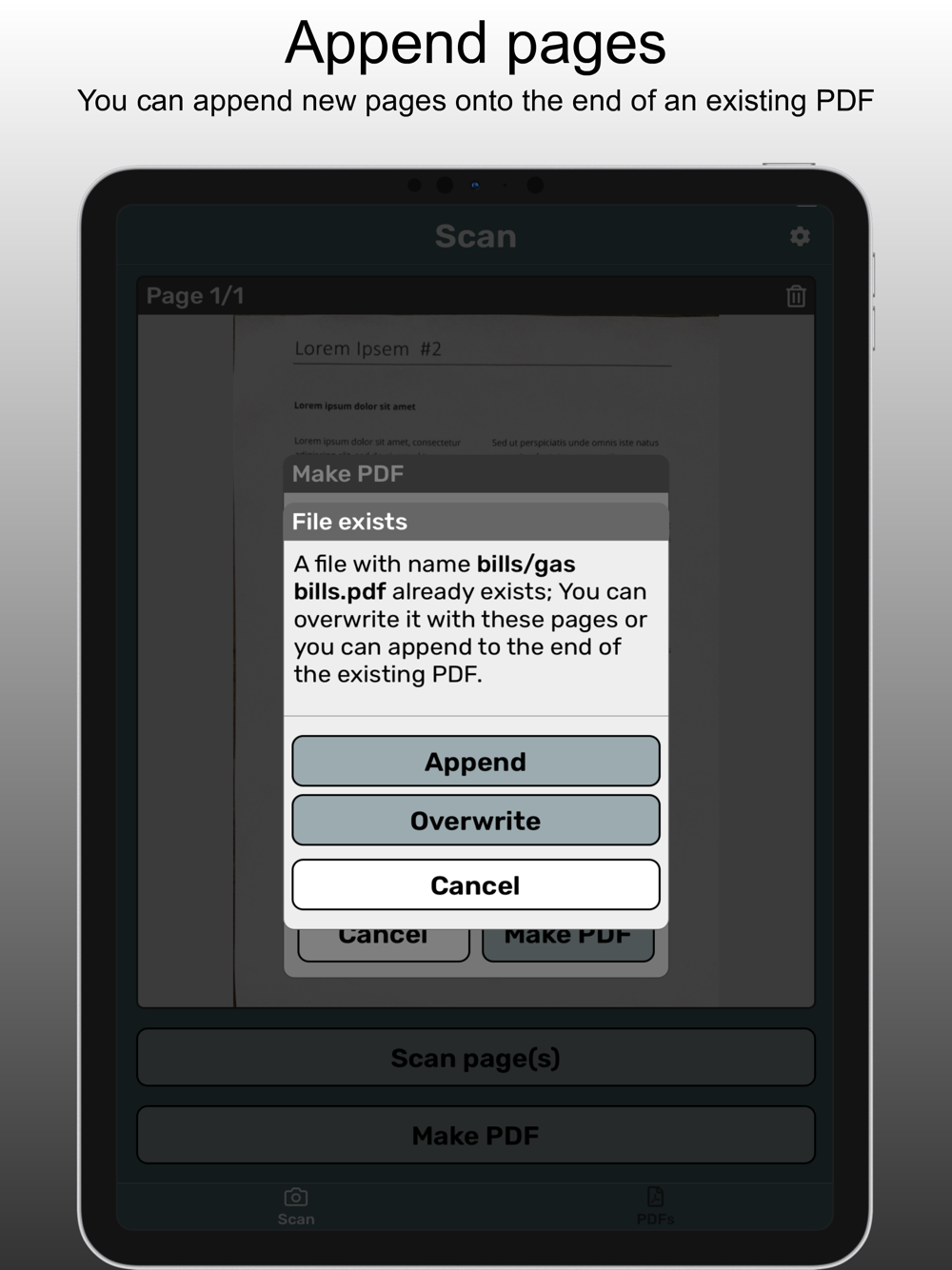 - Append: you can append pages to an existing PDF, useful for keeping all monthly bills in a single PDF by appending pages as each bill comes in.