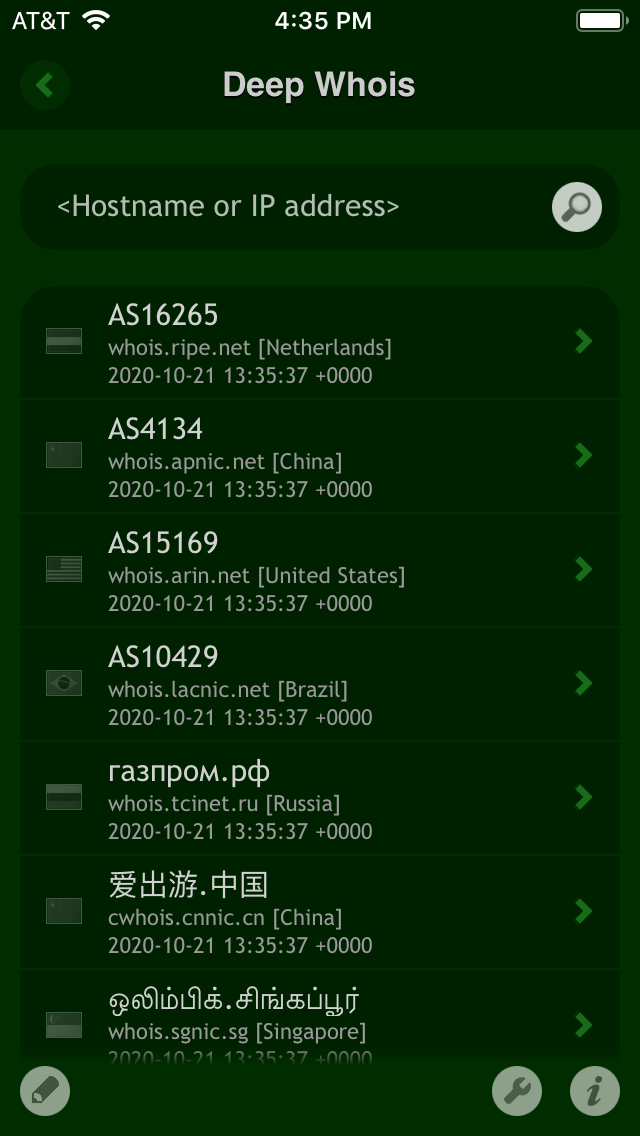- WHOIS domains, IP addresses, ranges, IDNs and ASNs
