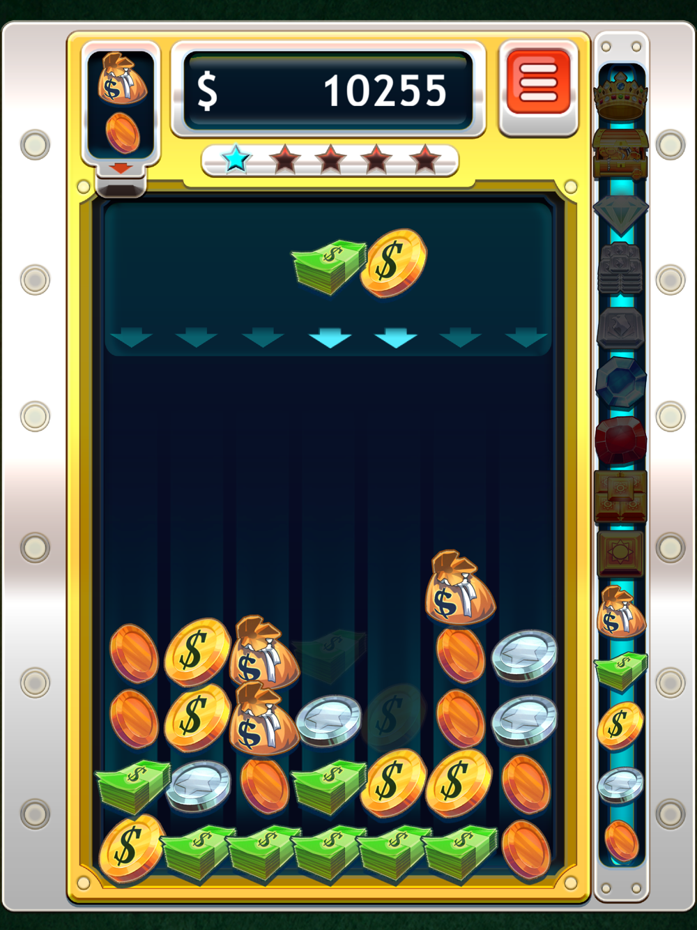 For example if you put together three silver pieces, they will turn into one gold piece. If you put together three gold coins they will turn into a banknote and so on. Thus, the more you progress in the game, the more the type of different objects in play increases.