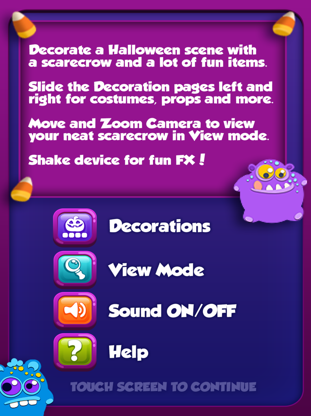 Use swipes to navigate through pages of decorations, and taps to place them on and off. Dimmer can be used to turn down the lighting in the scene.