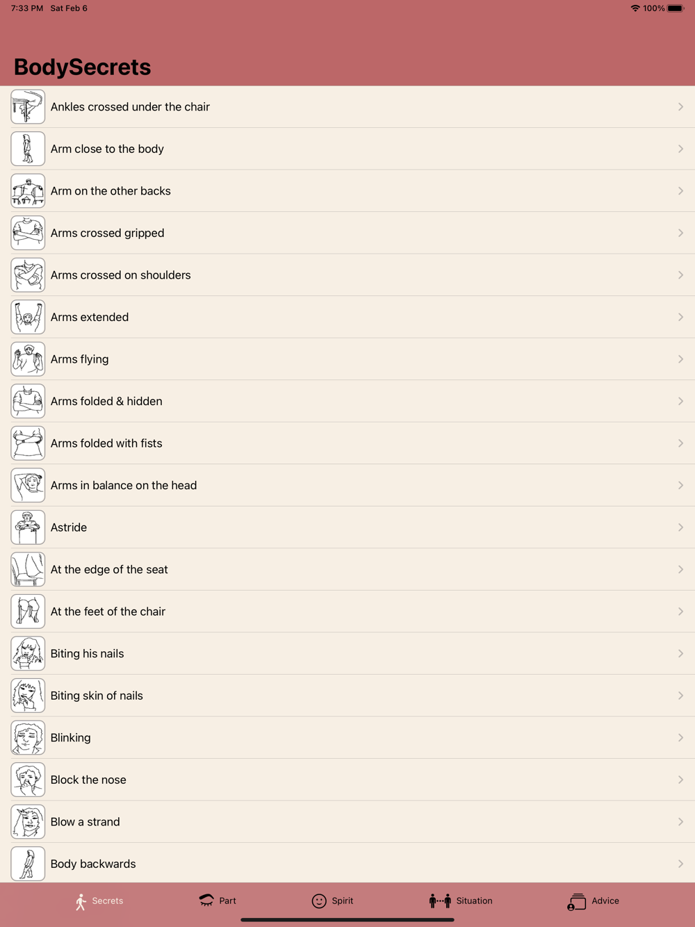 Body Secrets offers you a fast and discreet way to analyze 240 gestures and positions. Just note a person’s posture and movements then read the short description blurb to find out what someone really thinks about a subject, or to discover the type of person they are.