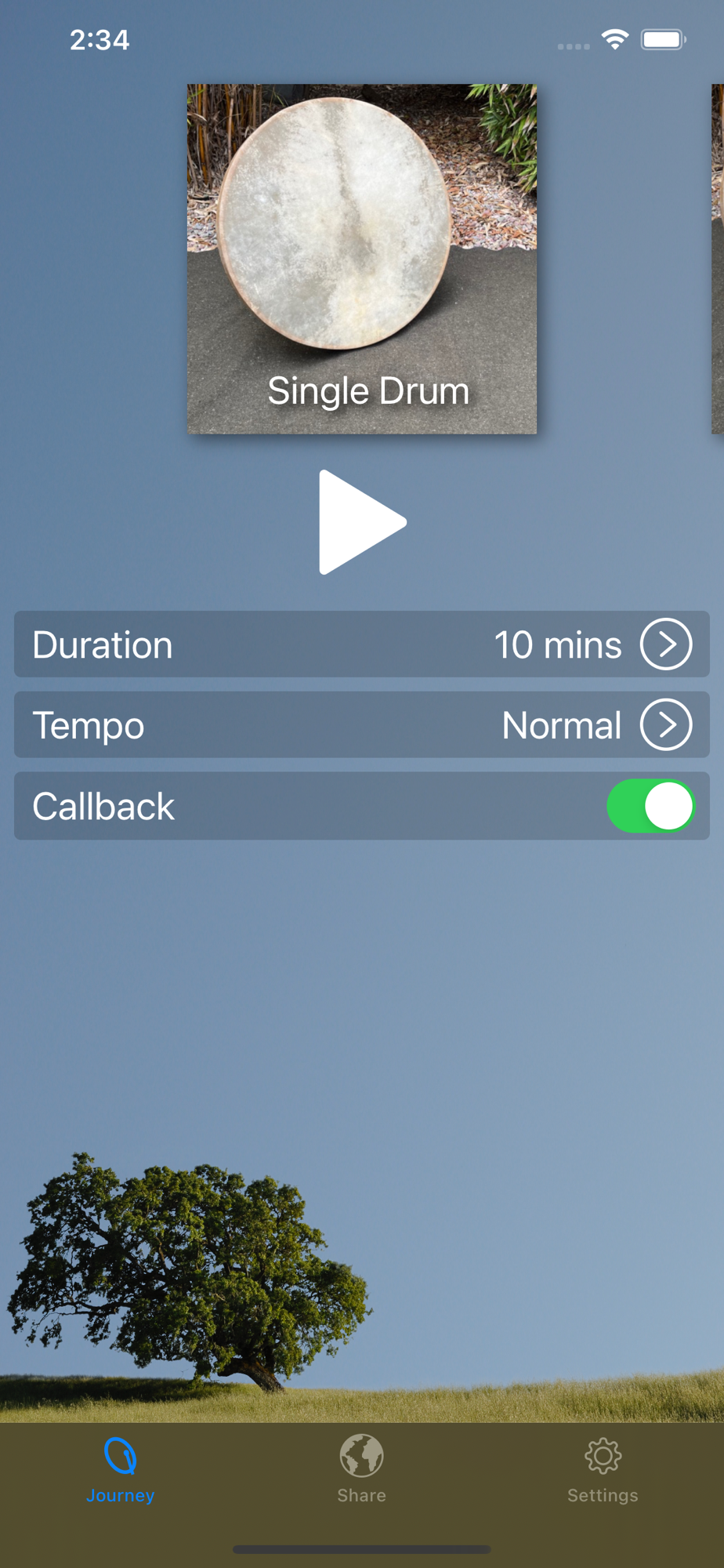 Drum Journey works like a timer; dial in the journey duration, set your options, and tap Start.  Included in the app are several professionally-produced drum and rattle tracks, and you can also import your own from iTunes.