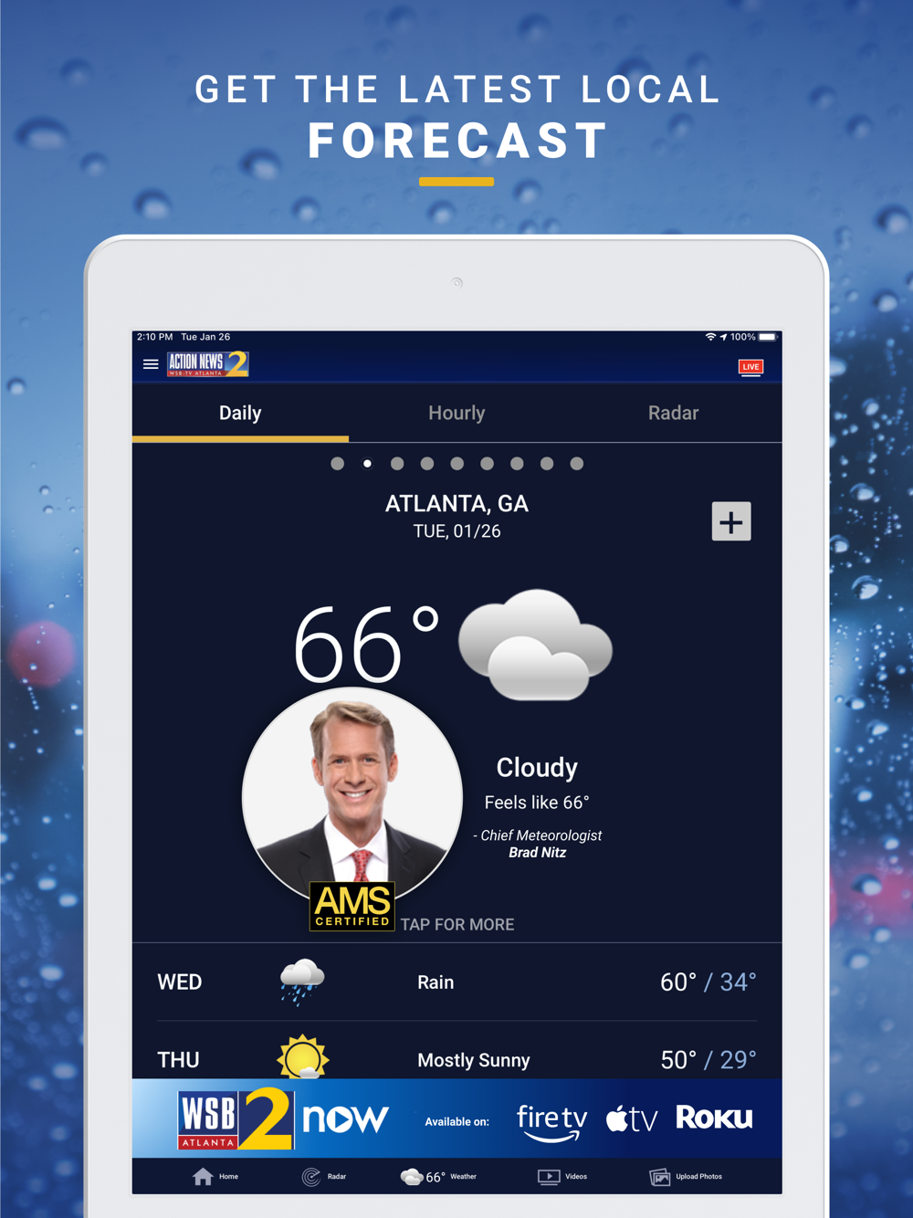 • Tracking storms minute-by-minute with StormTracker 2 HD radar and 24/7 access to the 5-day forecast so you know how the weather will impact your day.