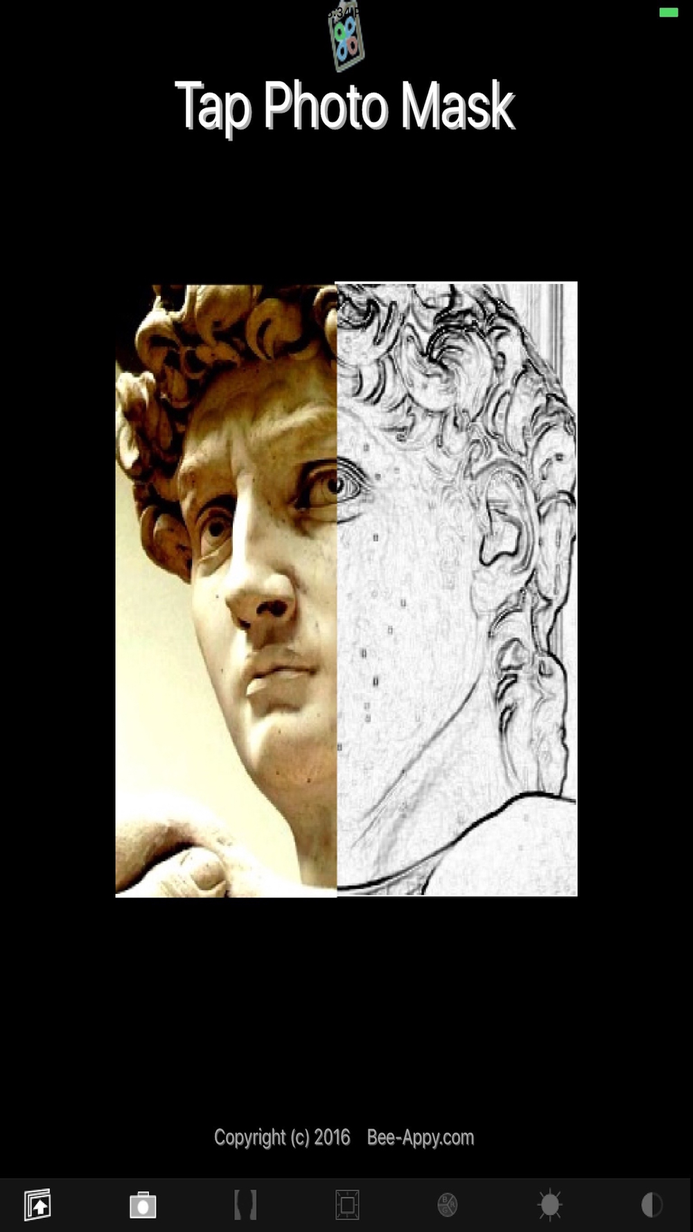 Tap Photo Mask (TPM) is a powerful photography and image modification application. It transforms your photos & images by applying a rendering mask - all with a tap of the screen. Tap to limit colors in the image. Convert to black & white. Outline the object in the image. Cartoonize it. Tap through all the masks & you're back at your original. Use the iPhone camera or your Photo Albums as the source for your images.