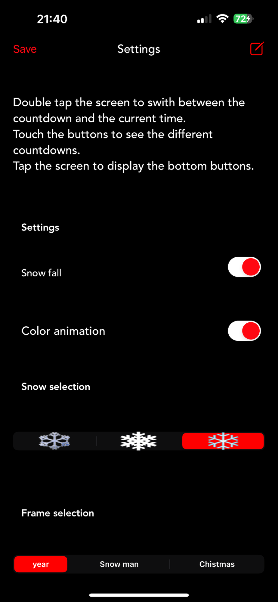 select a snowflake and a background frame according to your mood (or set them off) in the app settings!
