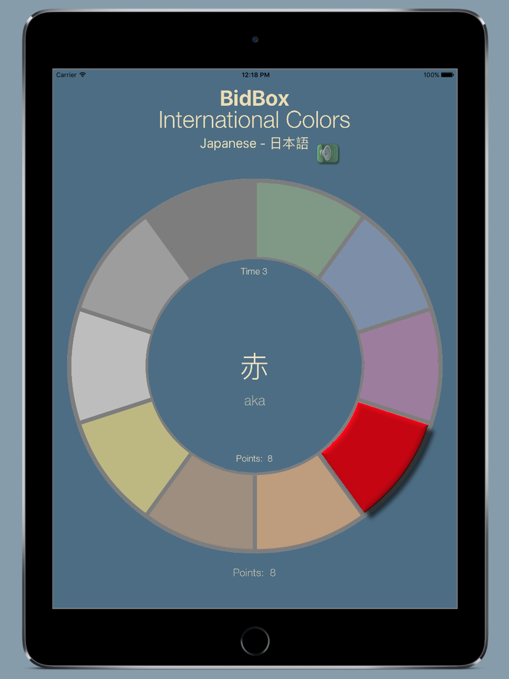 This game let's you identify colors in English, Spanish, French, Italian, German, Portuguese, Russian, Chinese, Japanese and Turkish and more.