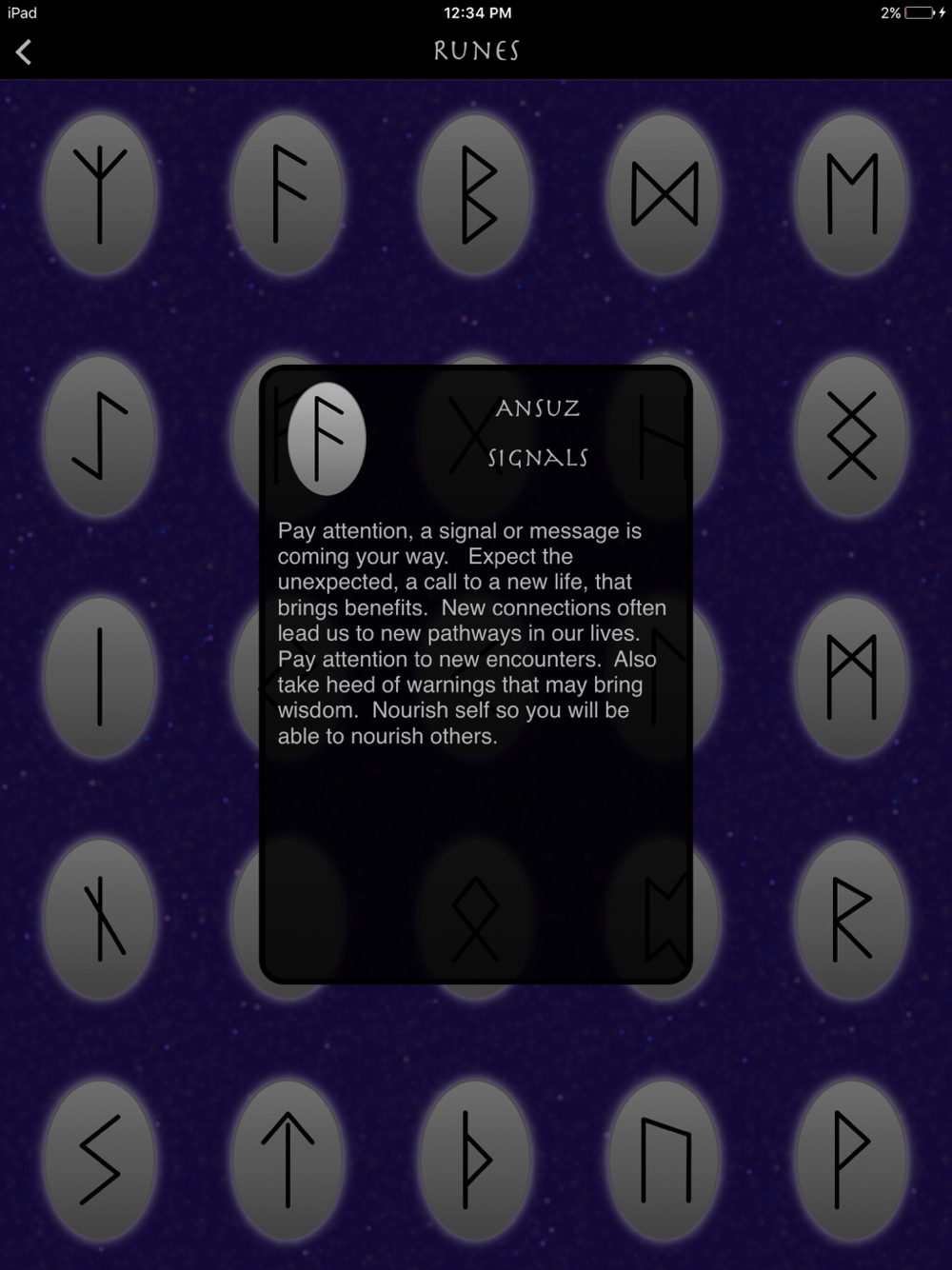 Runes have been used for centuries to guide those who seek their unique properties, powers, and wisdom. Though the casting of runes cannot divine the future, for those who consult them regularly, they can provide insight into the road ahead or the paths one might take at any given time. The runes can be consulted on any matter of importance and multiple castings can be used to find any of a number of perspectives from which to proceed. If one approaches the runes in an honest and sincere manner, the insight they can provide is often surprisingly accurate to the situation at hand. Viking Runes offers up the following features: