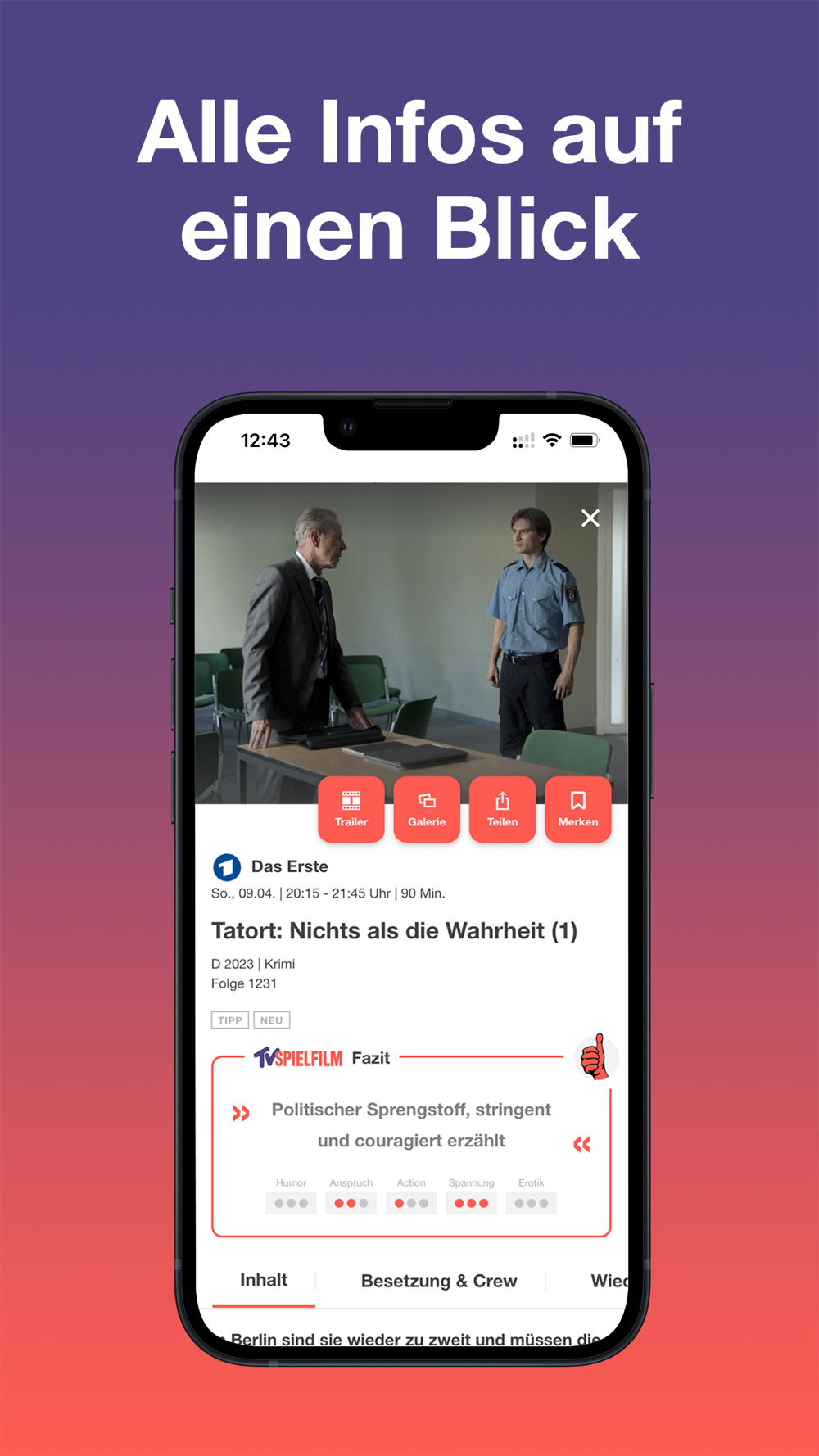 Mit der TV SPIELFILM App erhältst du eine umfassende Übersicht über das Fernsehprogramm sowie die besten Filme und Serien aus Mediatheken wie ARD, ZDF, RTL und mehr. Neu: Entdecke Empfehlungen und Insider-Tipps für Streaming-Inhalte von Plattformen wie Netflix, Amazon Prime und Disney+.