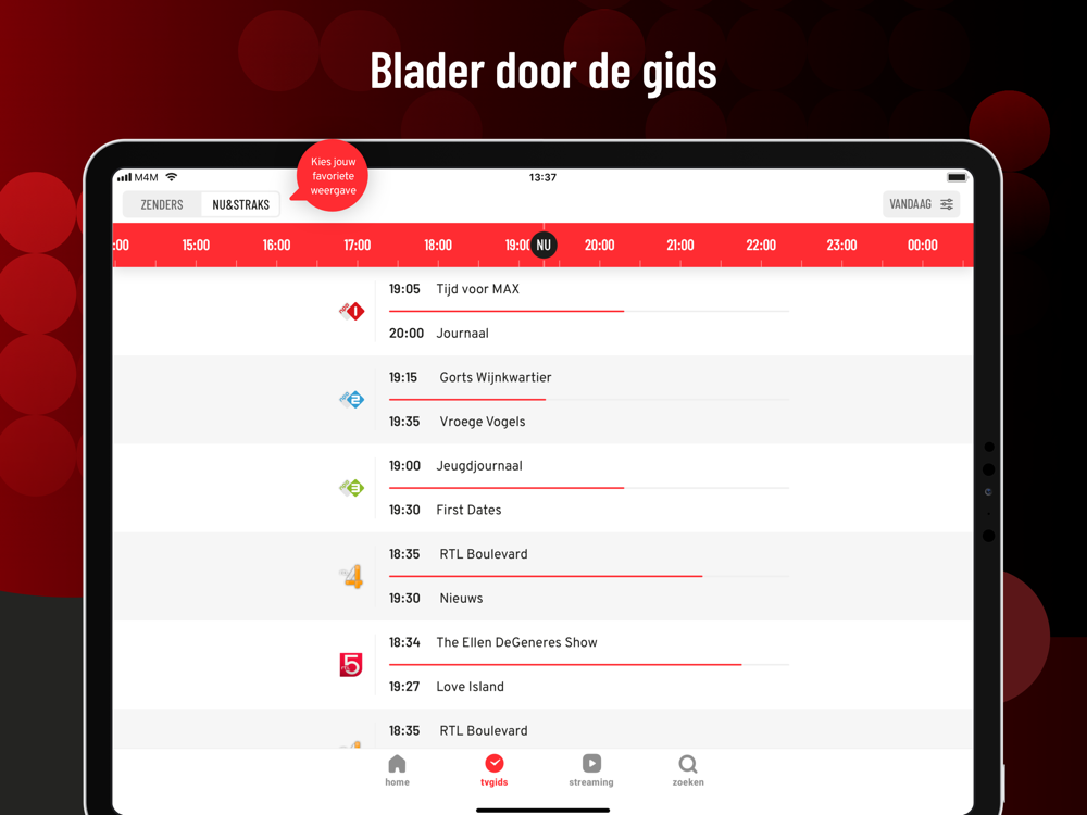 Of het nou vanmiddag, vanavond, vannacht, straks of morgen is, op je tv, tablet of telefoon: met de app van TVgids.nl kijk je hoe en wanneer je wilt. Met de app zoek en vind je de programma's die je écht wilt zien. Kijk naar sport (bijvoorbeeld voetbal, formule 1, tennis of schaatsen), een romantische of actiefilm of de nieuwste series. Geniet van programma's over kunst, cultuur en muziek. Volg het laatste nieuws, bekijk een goede documentaire of de leukste kinder-tv! Met TVgids.nl weet jij wanneer je wat kunt zien en waar je écht naar moet kijken. Hier vind je een compleet overzicht van wat er op televisie is, zowel live als bijvoorbeeld via Netflix of Videoland.