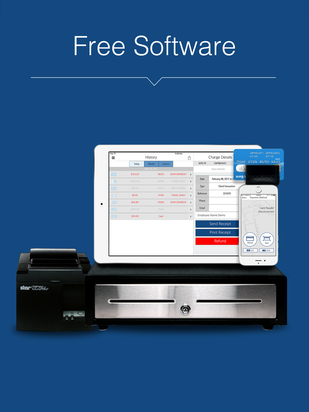 Track credit, cash and check anywhere, anytime. Our cash register app allows you to take payments on the go or at your retail location. Incliudes free hardware and unlimited users.