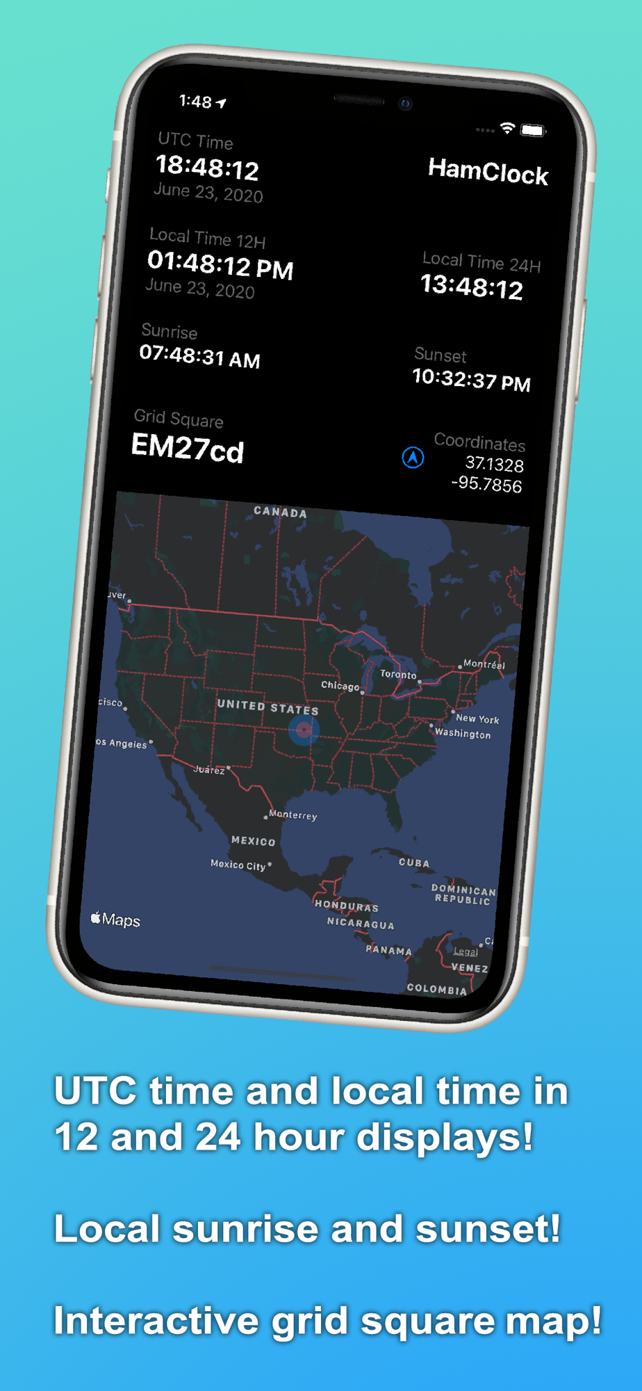 One screen shows your local time in 12H and 24H format along with UTC in large, easy to read text. If your location is available, your grid square, local sunrise and sunset are also displayed.