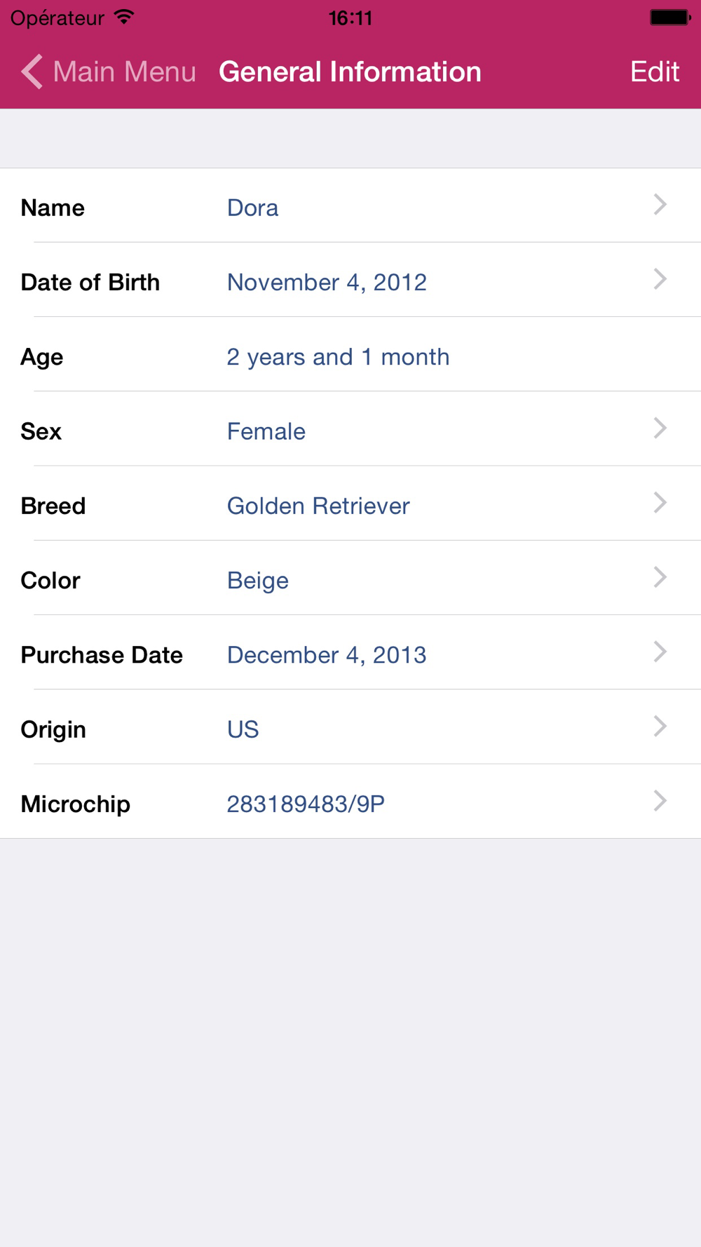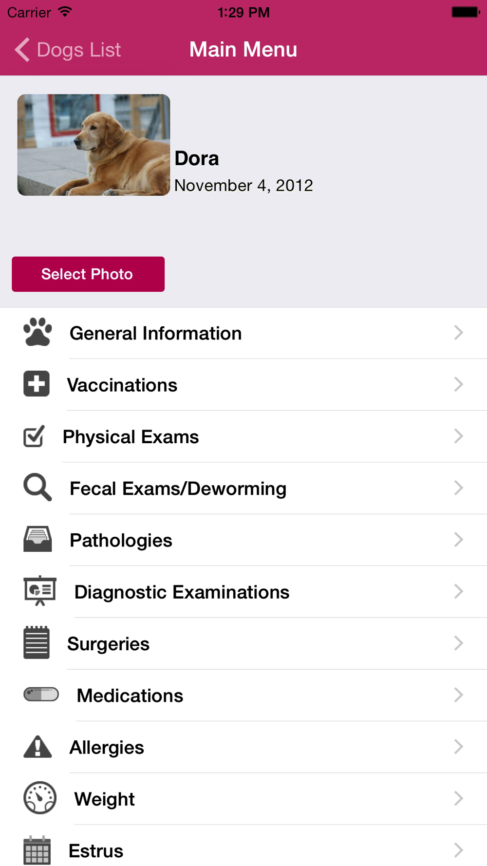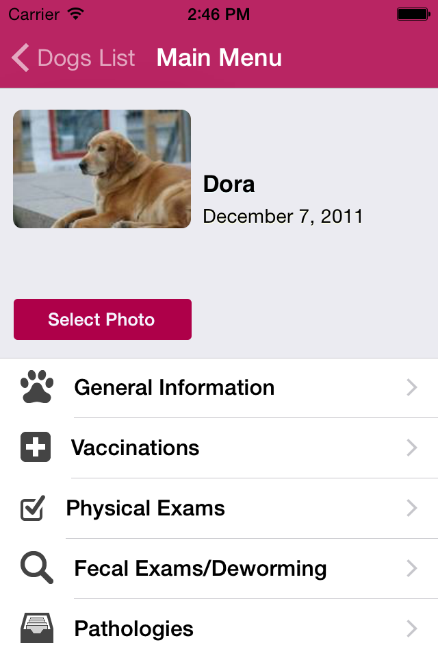 Here is an application that will enable you to keep track of and always have to hand all information relative to the health of your dogs: general information (such as breed, color, microchip information, ...), vaccinations, physical examination, medications , allergies, diagnostic tests and results, ...