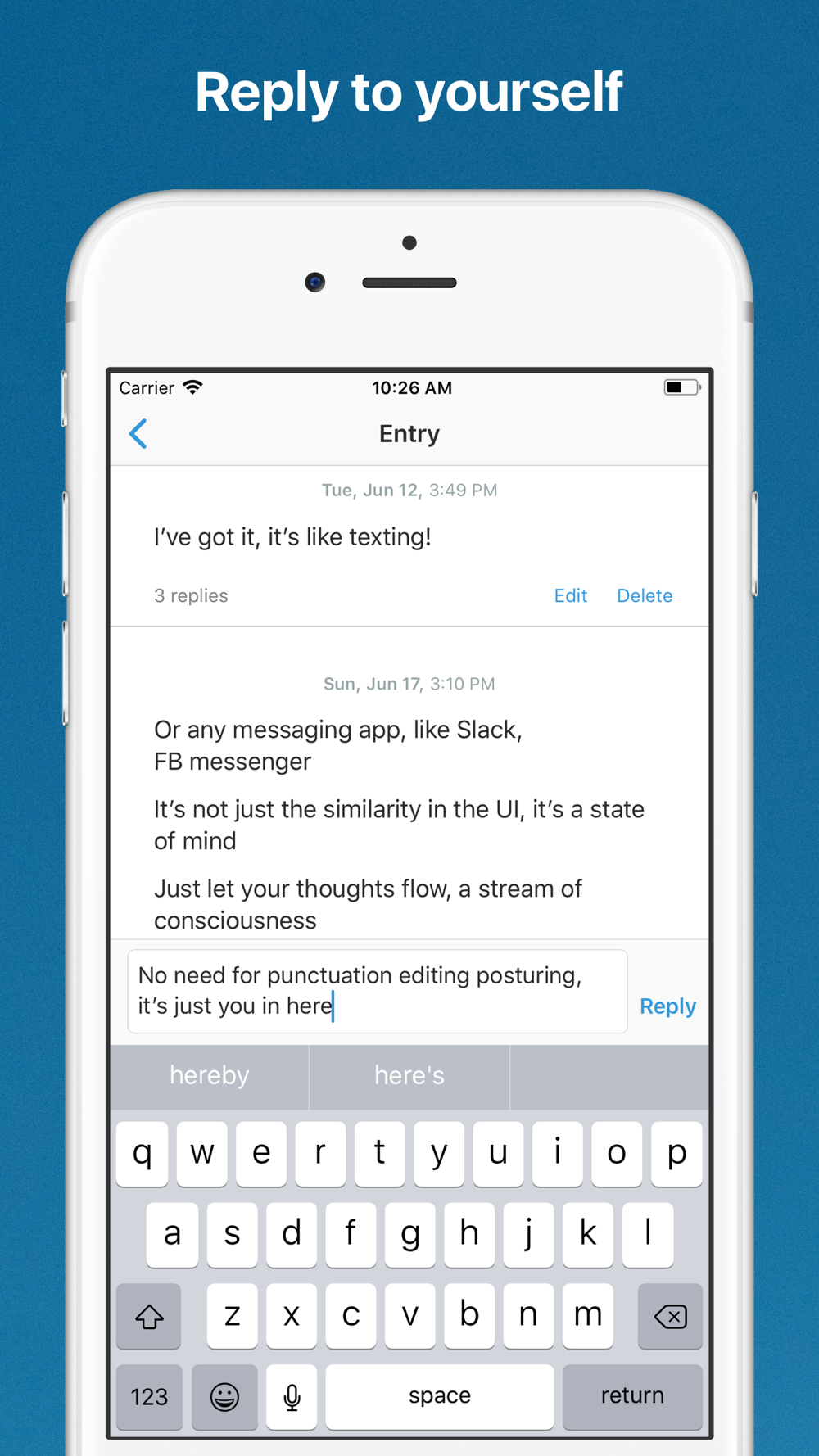 Monologue is a new kind of journaling app that's as easy as texting. Just type and send, and your entries will be grouped by time, like your texting app. You can also group your entries into stories, and reply to your older entries.