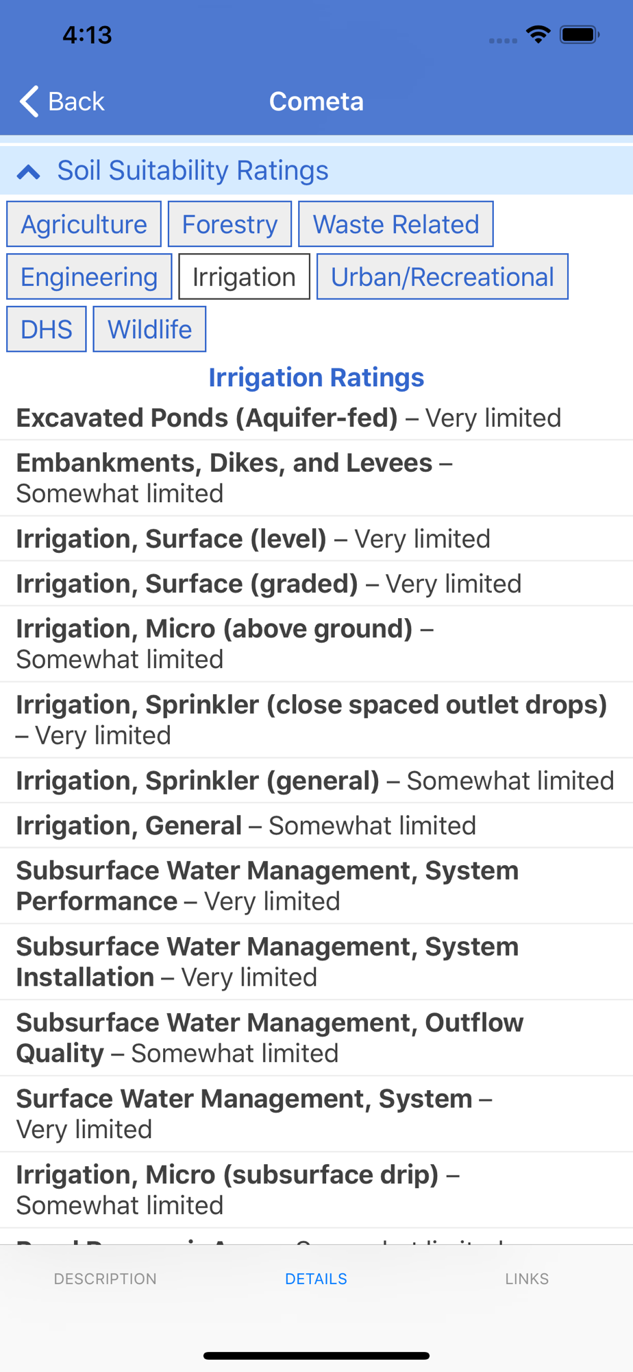 - Component details: soil taxonomy, soil property depth profiles, land classification ratings, hydraulic and erosion ratings, forest productivity, soil suitability ratings.