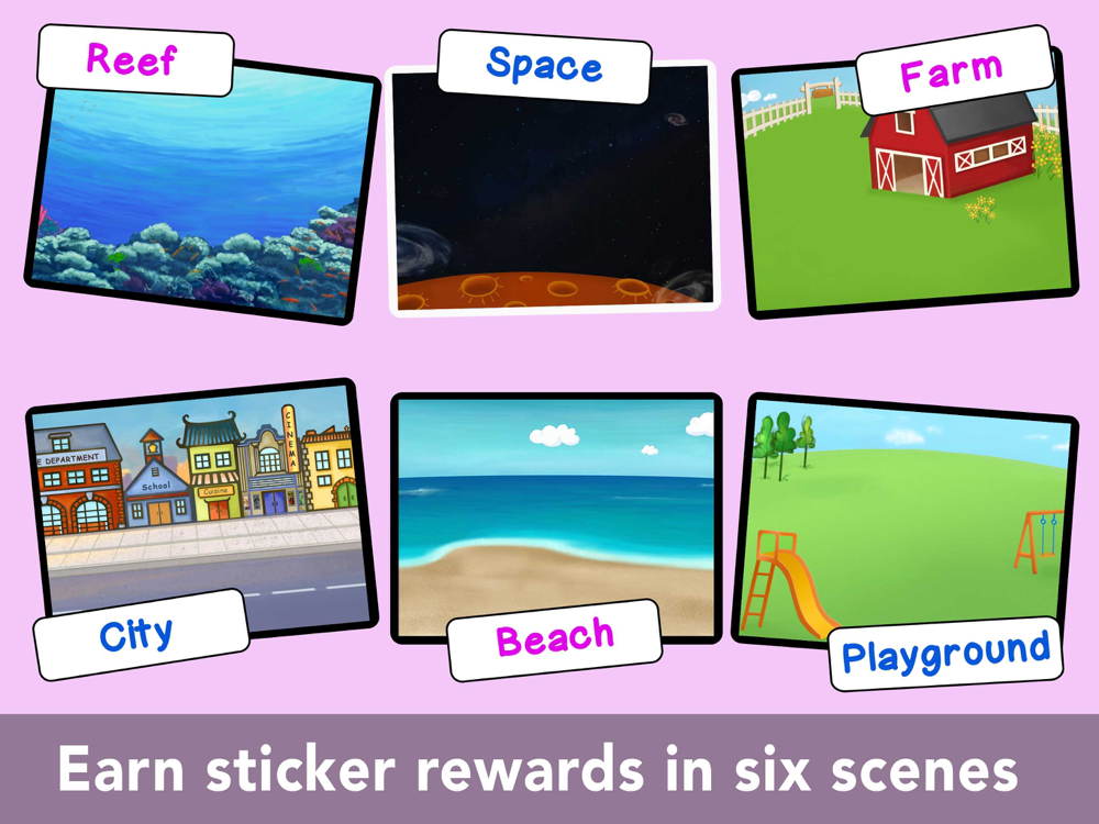 • 7 different sticker reward scenes: space, playground, beach, underwater reef, pirate cove, city, farm