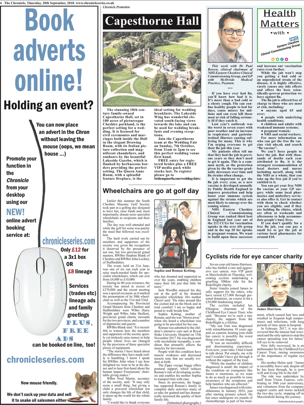 Regular features in the Congleton Chronicle include: Local News, Readers’ Views, a comprehensive property guide, What’s On... What’s Gone and much more.