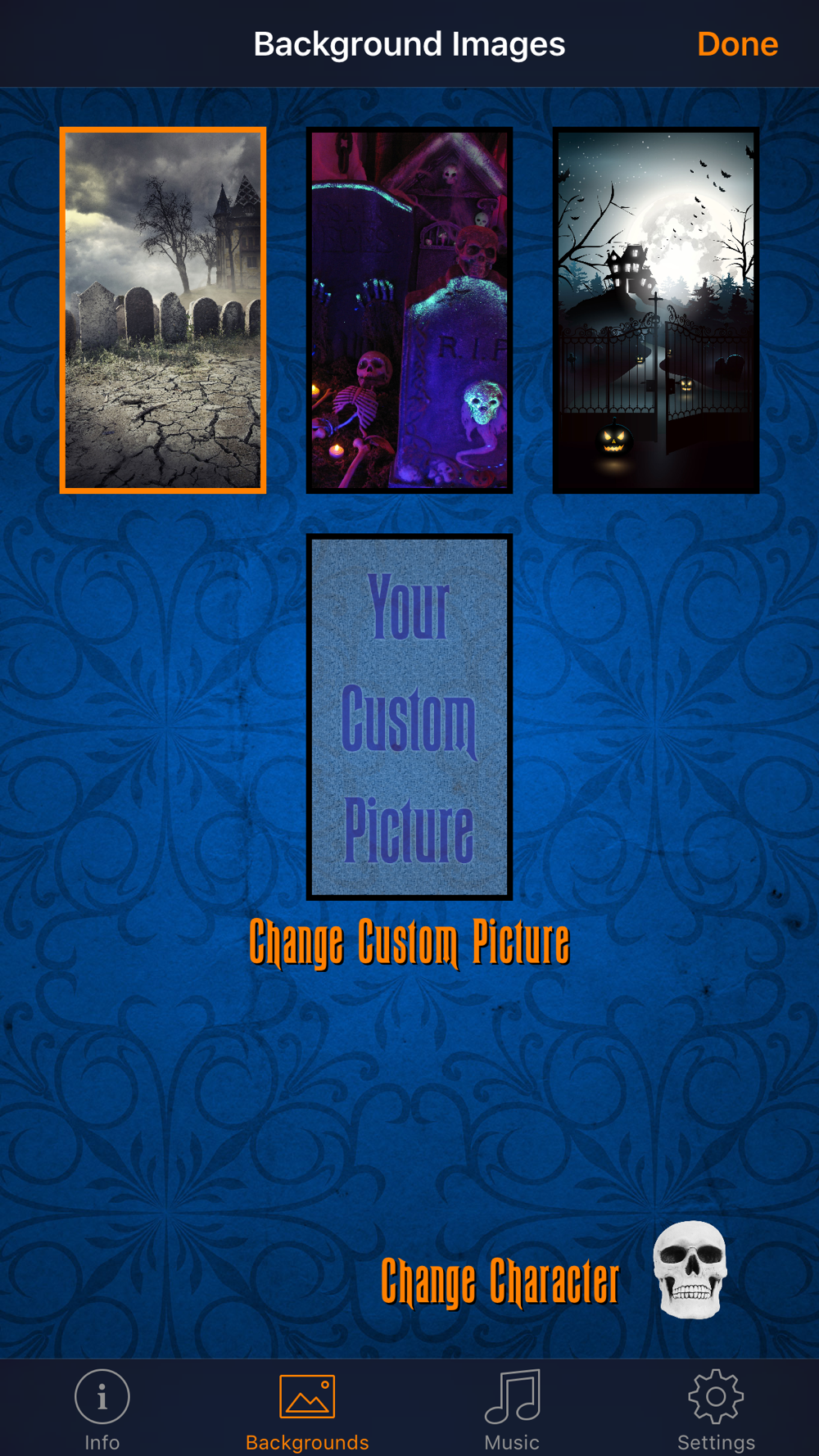 • Select any background image from your device's photo album or use one of the 3 included haunted images.