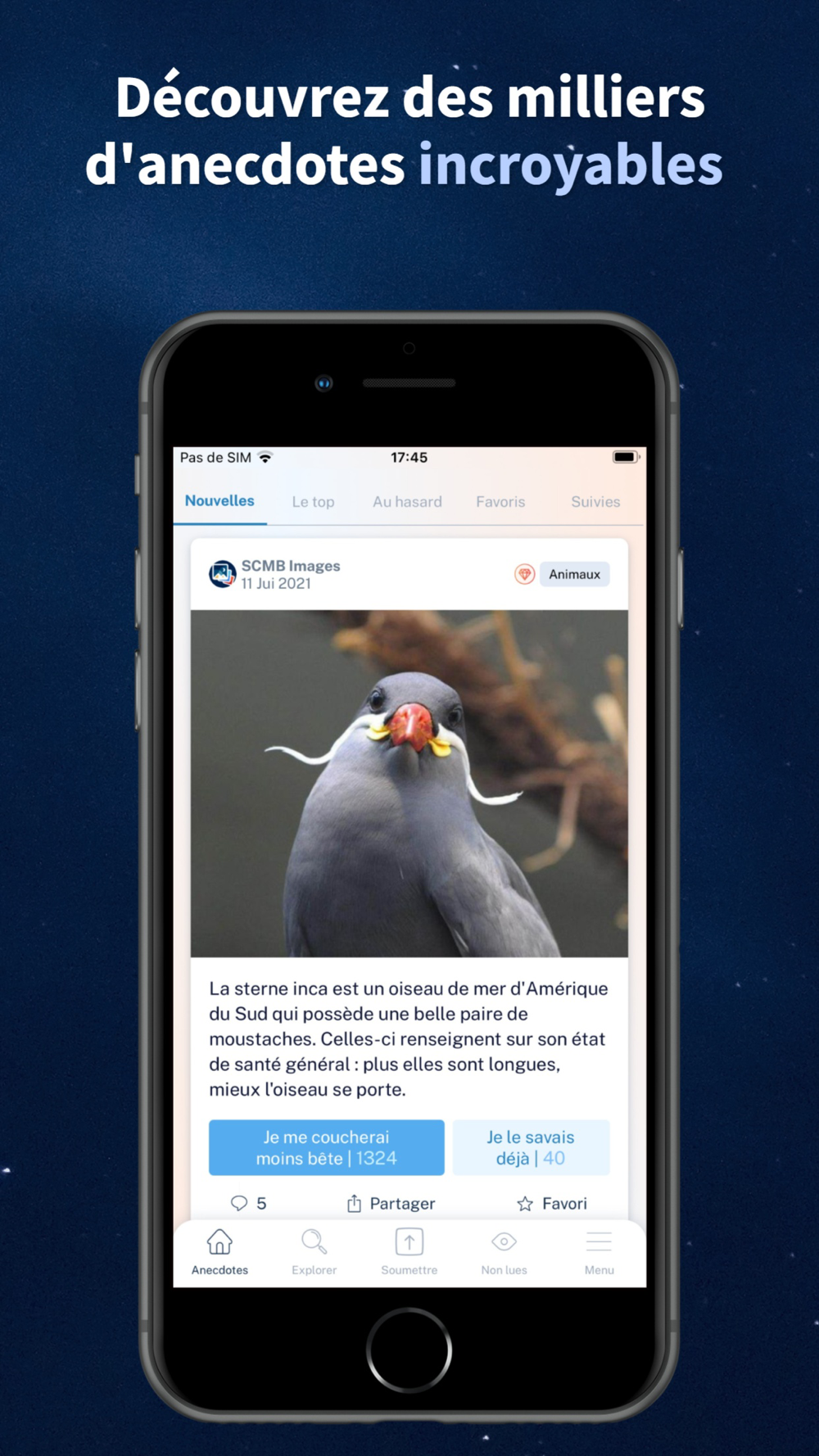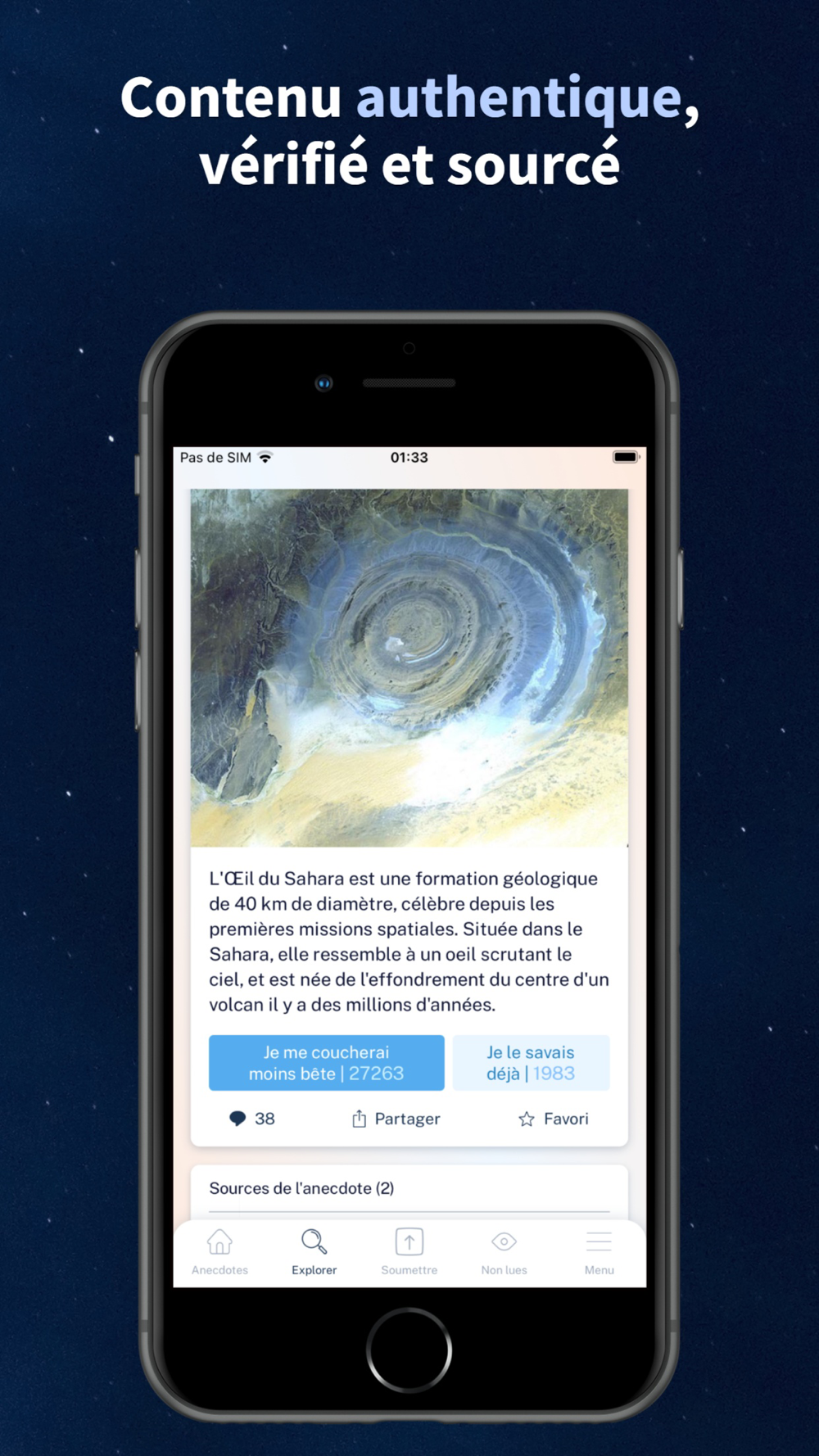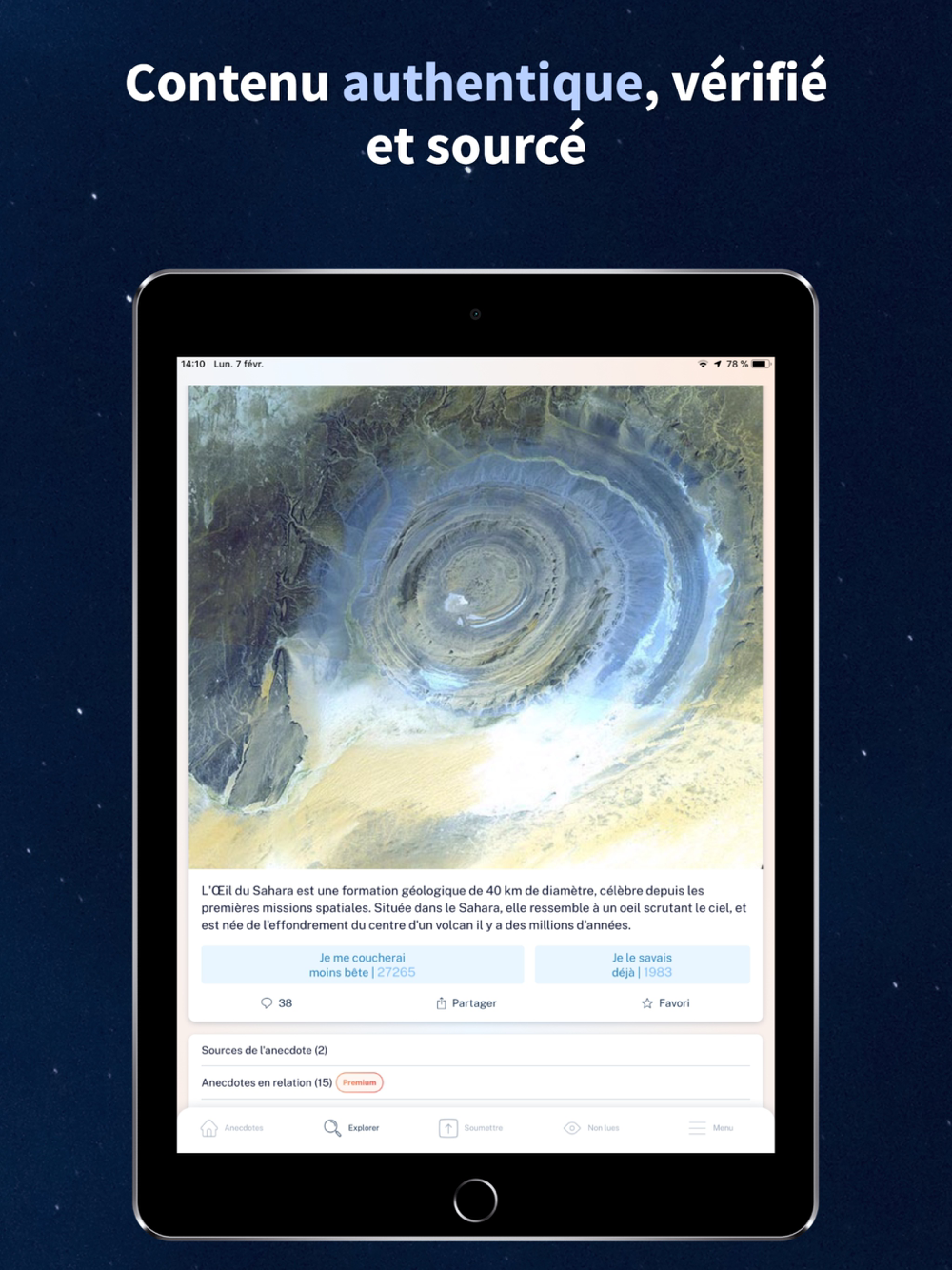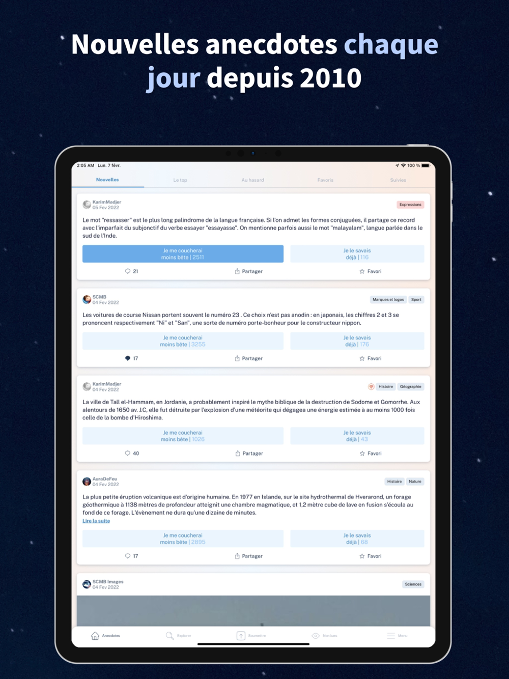 Découvrez 15 000 anecdotes inédites, amusantes ou surprenantes sur tous les sujets : science, cinéma, musique, people, santé, histoire, sport, cuisine etc.. De nouvelles anecdotes sont ajoutées quotidiennement depuis 12 ans sans exception. Vous pourrez les modérer, commenter, ajouter à vos favoris, naviguer selon vos thèmes préférés ou sur une carte pour retrouver celles proches de chez vous. Des heures de découverte amusante, tout en se cultivant.