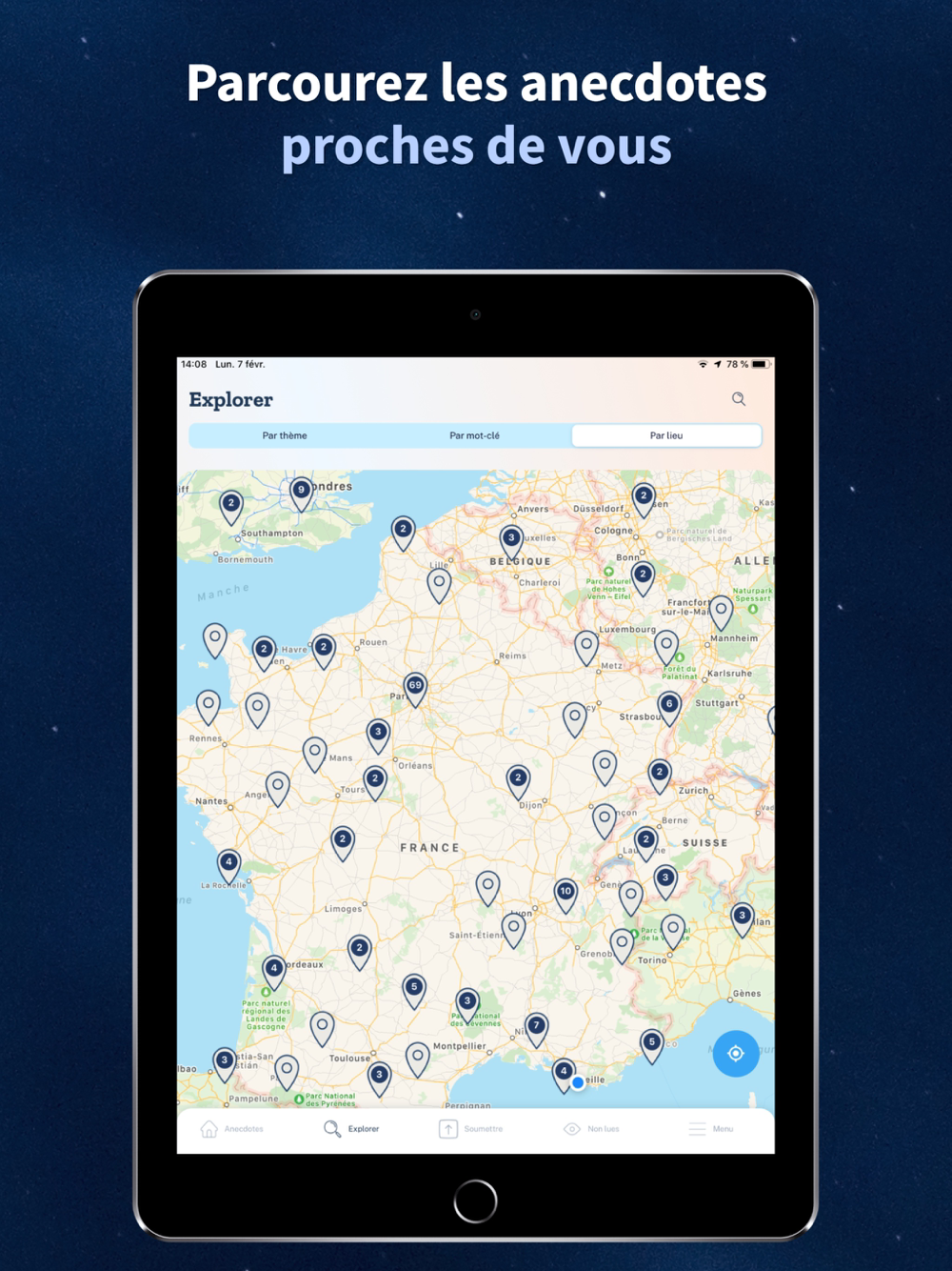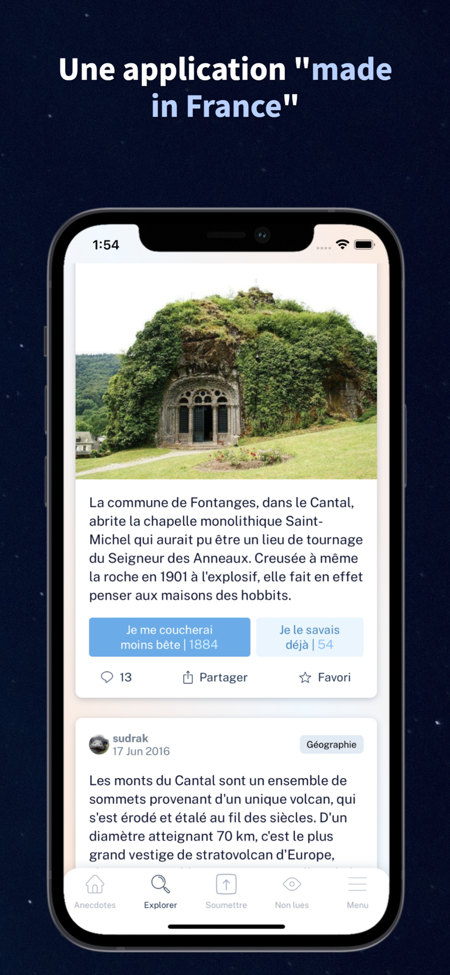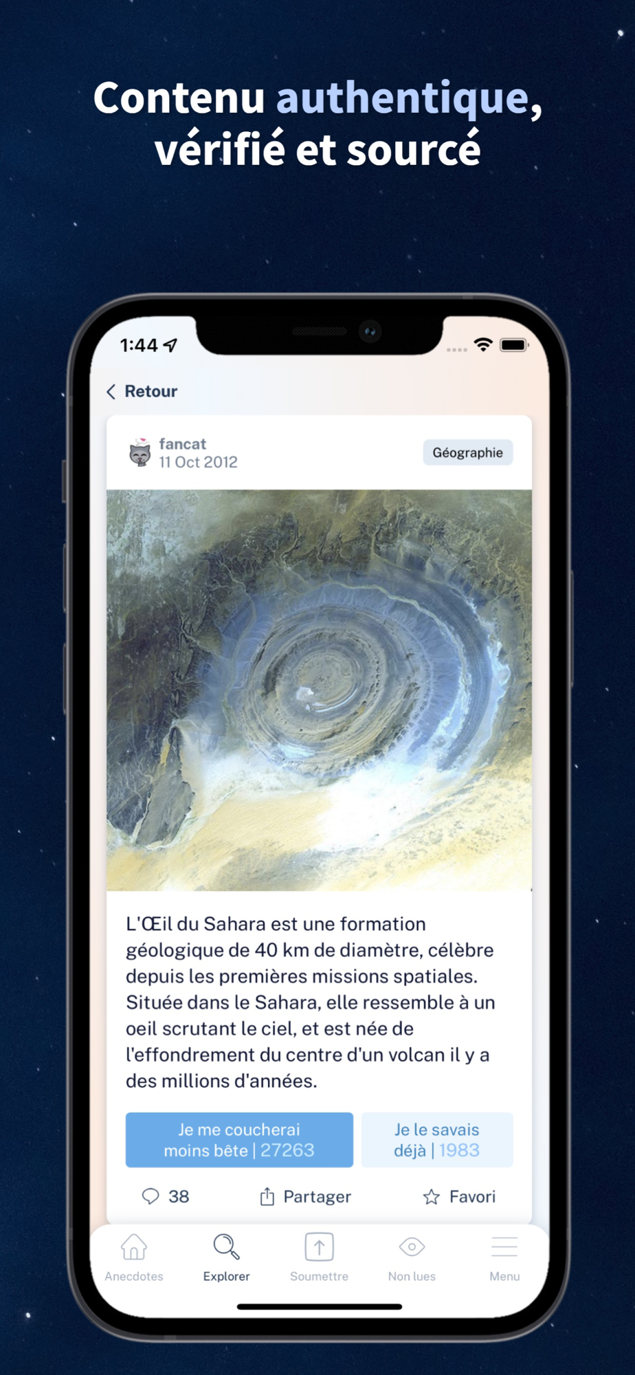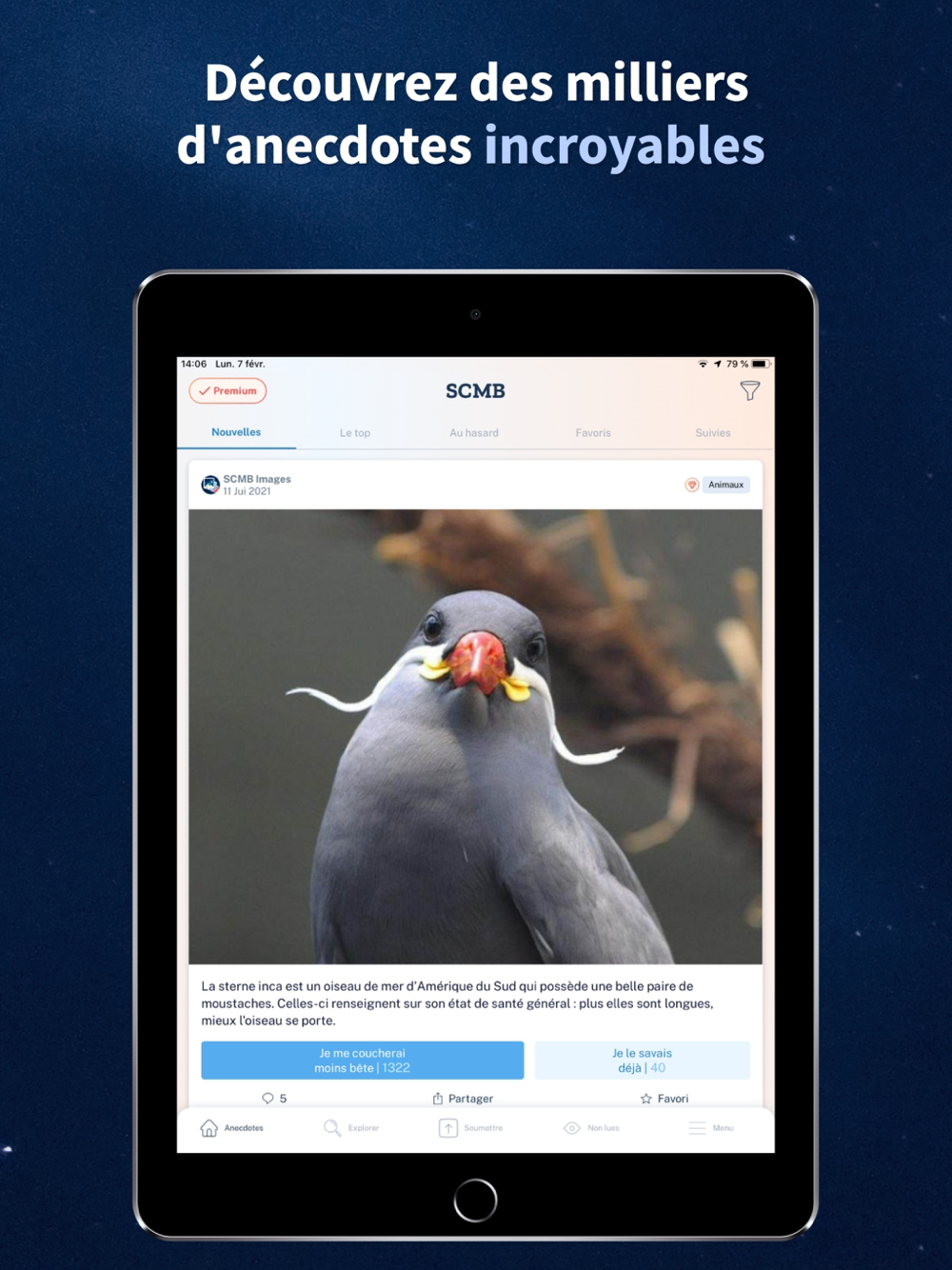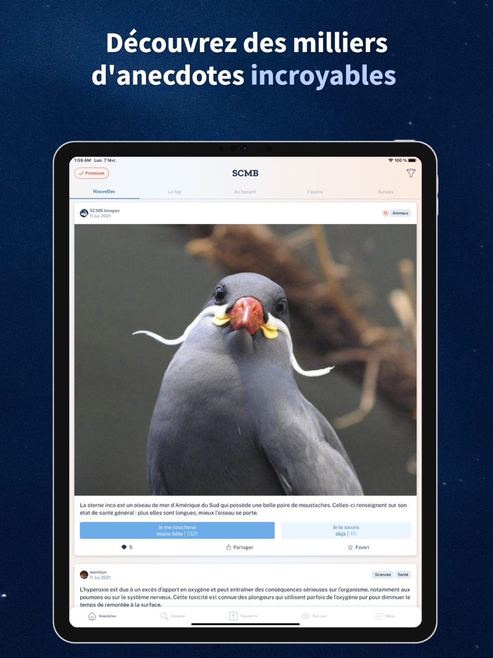 Découvrez 15 000 anecdotes inédites, amusantes ou surprenantes sur tous les sujets : science, cinéma, musique, people, santé, histoire, sport, cuisine etc.. De nouvelles anecdotes sont ajoutées quotidiennement depuis 12 ans sans exception. Vous pourrez les modérer, commenter, ajouter à vos favoris, naviguer selon vos thèmes préférés ou sur une carte pour retrouver celles proches de chez vous. Des heures de découverte amusante, tout en se cultivant.