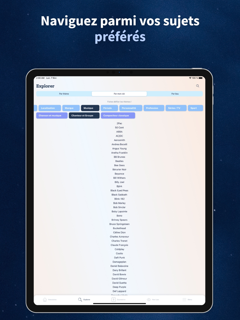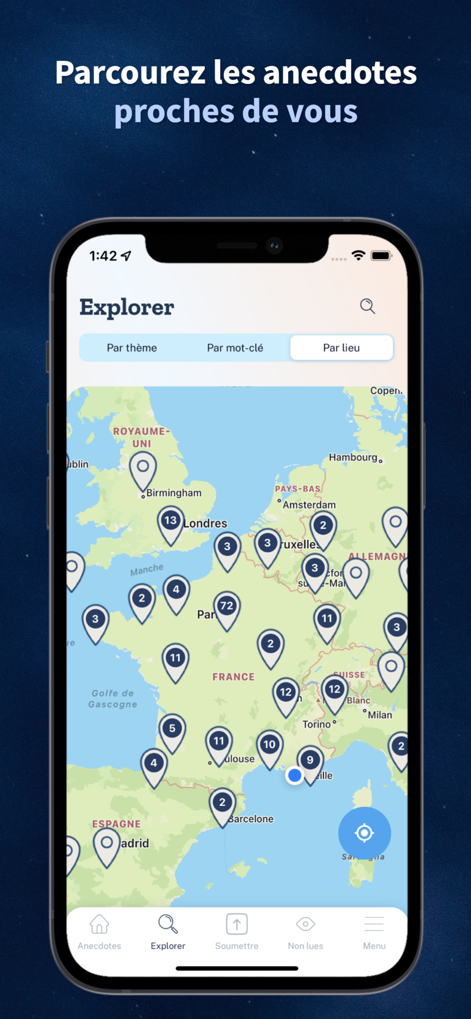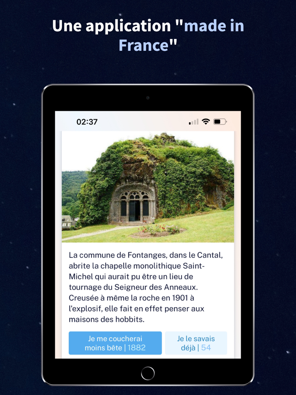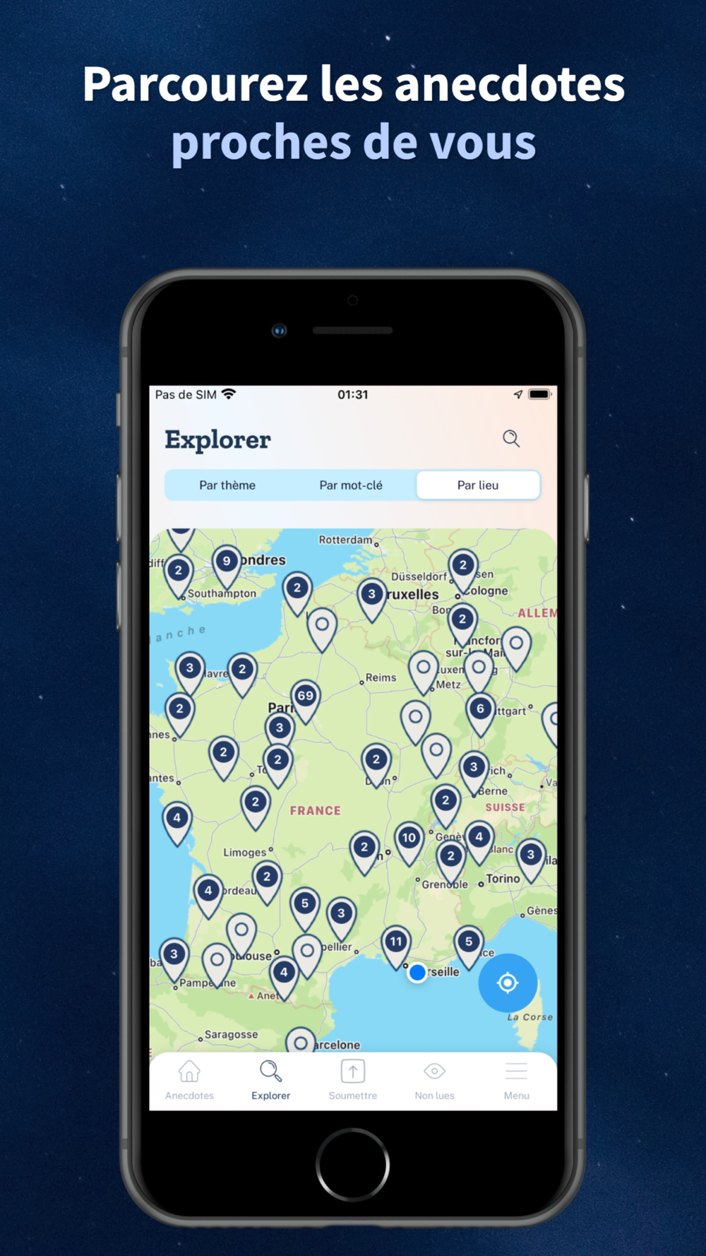Découvrez 15 000 anecdotes inédites, amusantes ou surprenantes sur tous les sujets : science, cinéma, musique, people, santé, histoire, sport, cuisine etc.. De nouvelles anecdotes sont ajoutées quotidiennement depuis 12 ans sans exception. Vous pourrez les modérer, commenter, ajouter à vos favoris, naviguer selon vos thèmes préférés ou sur une carte pour retrouver celles proches de chez vous. Des heures de découverte amusante, tout en se cultivant.