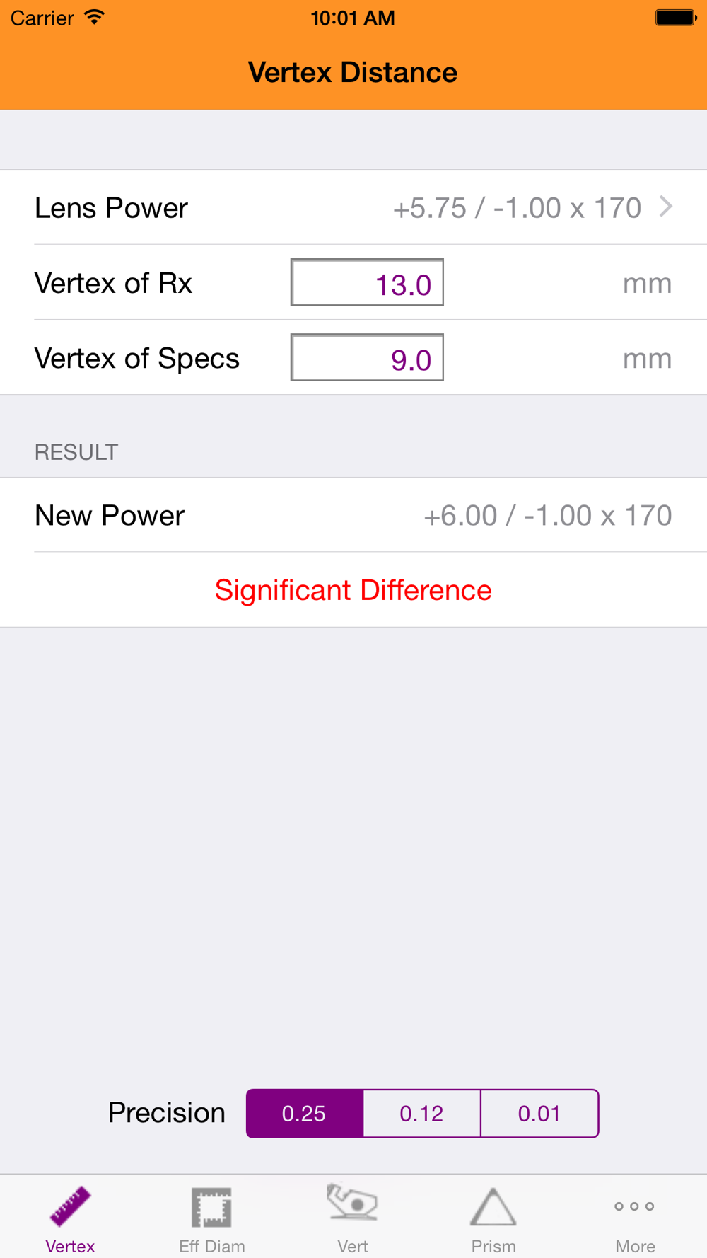 Vertex Distance: Enter the lens power & two vertex distances. LensCalc will give you the new power required, and tell you if the difference is significant.