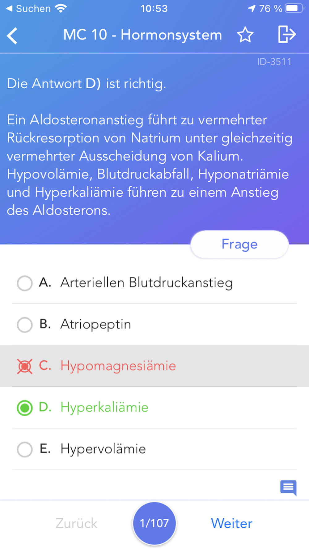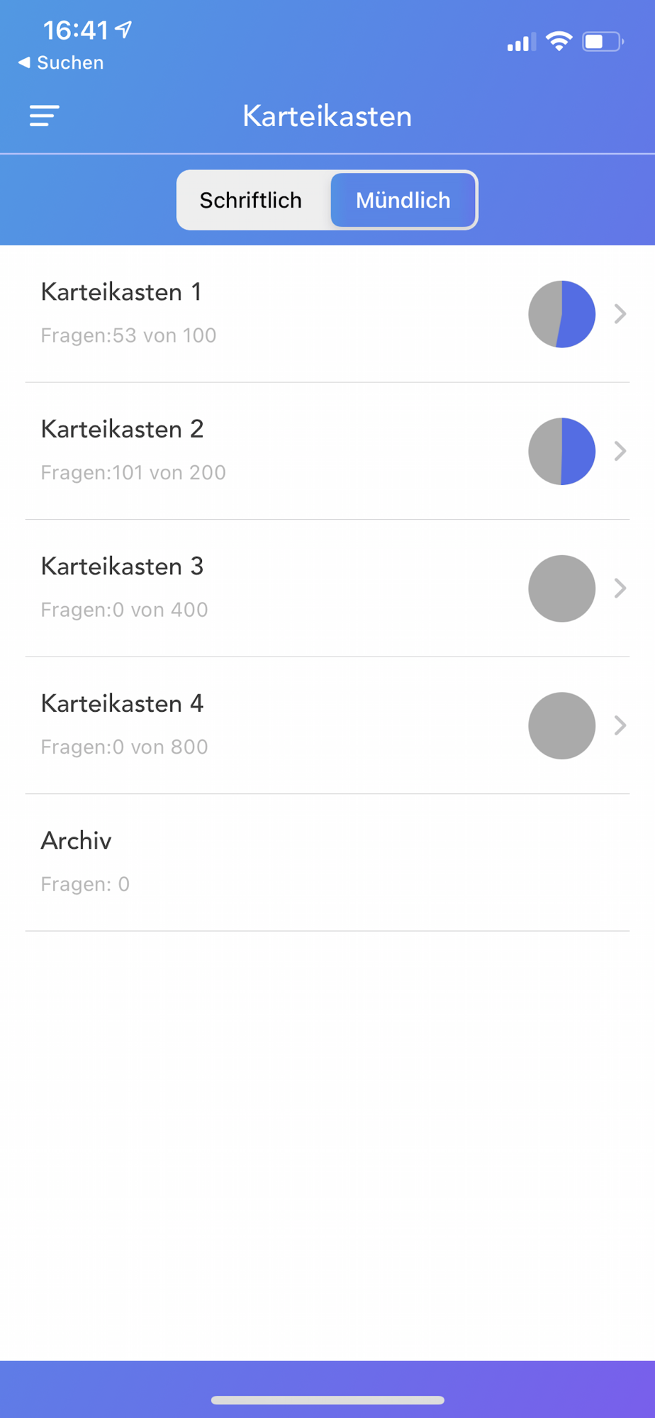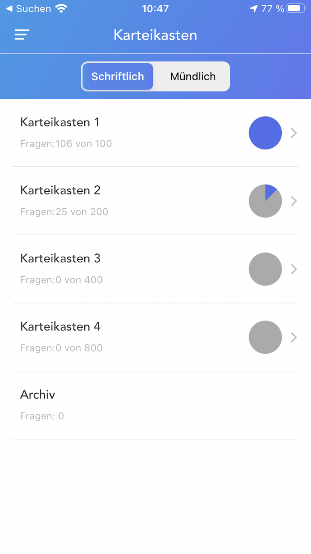 Der integrierte Karteikasten sammelt für Sie alle falsch beantworteten Fragen.