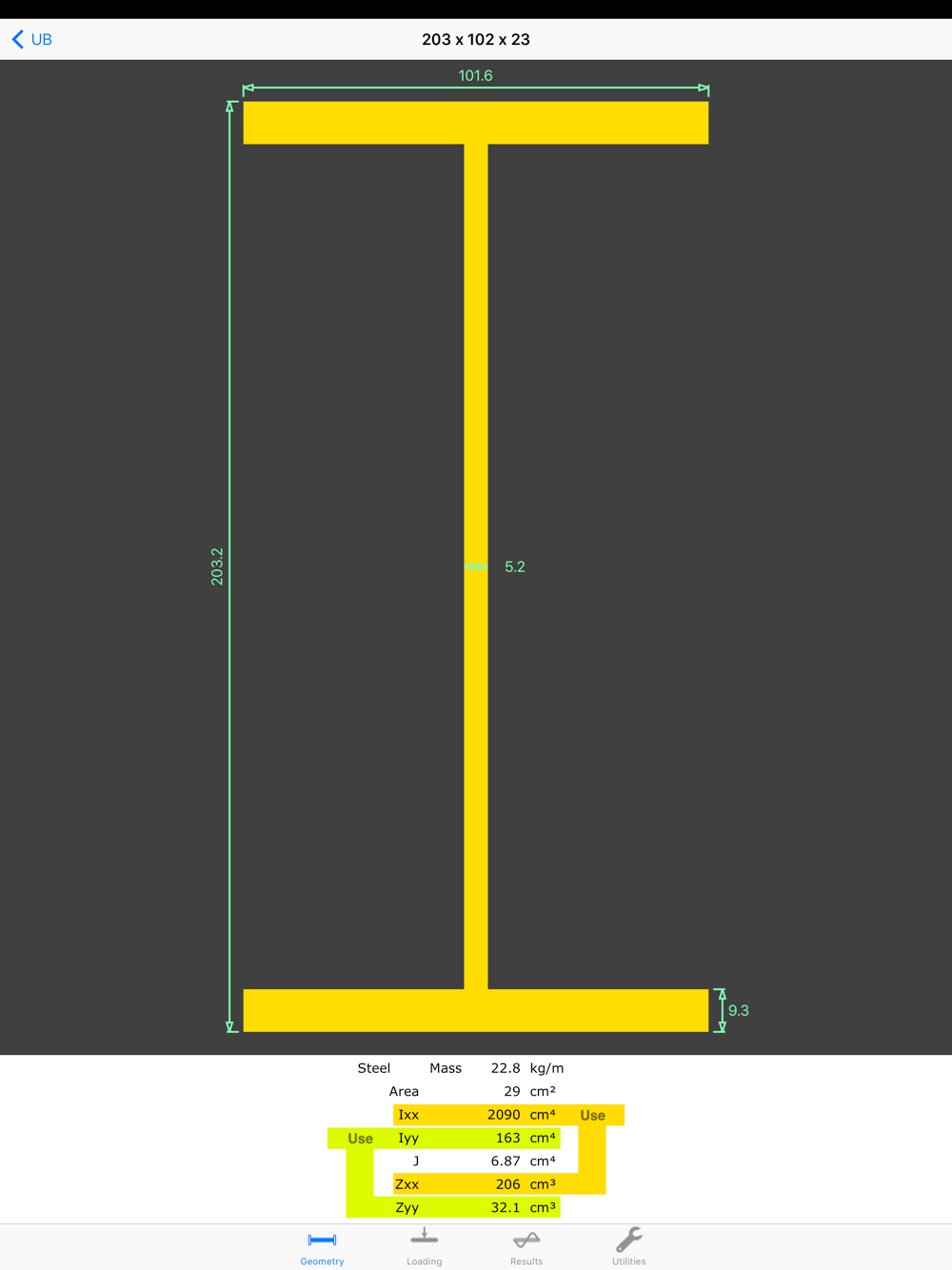 - Diagram and properties will appear; tap on a Use button to pick major or minor axis.