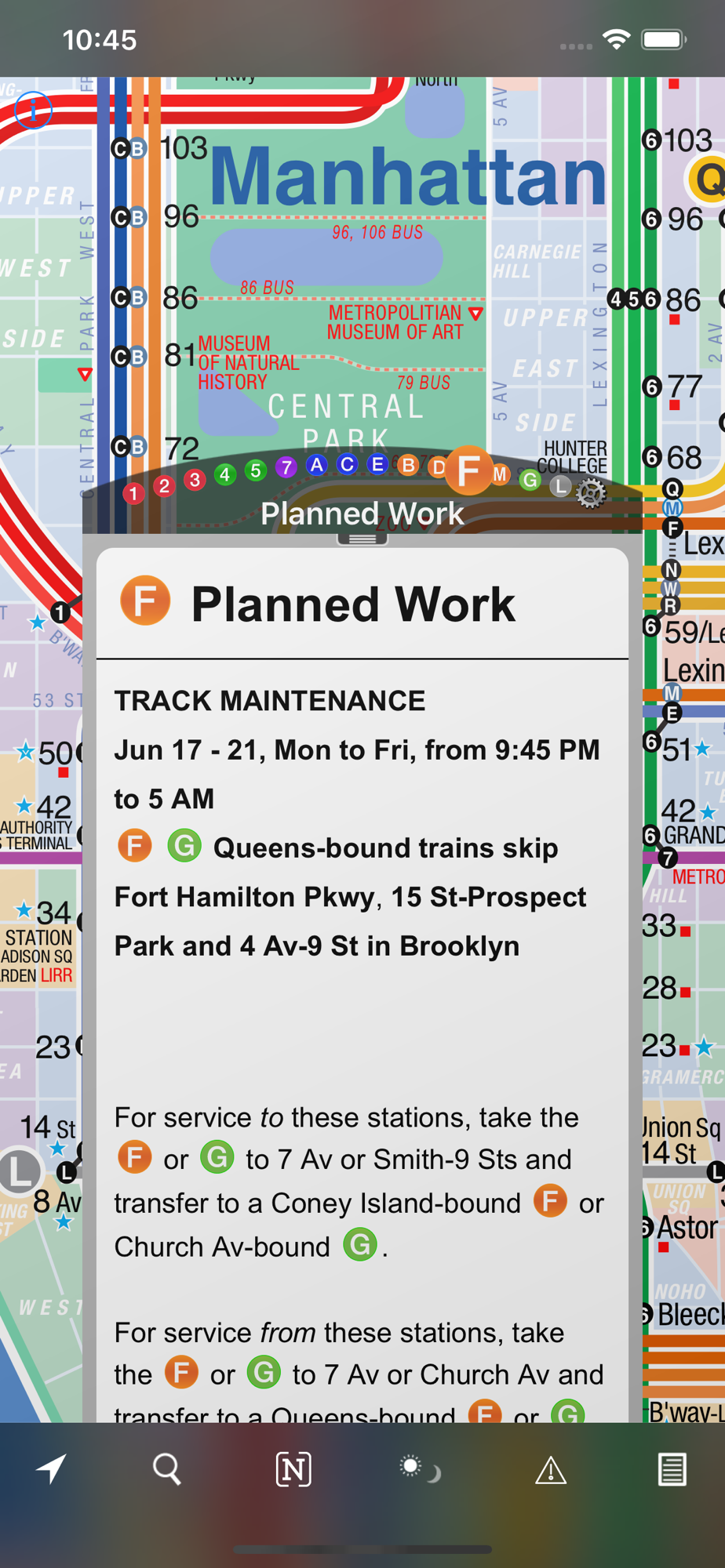 Service Advisories with push notifications show the latest news from the MTA on service delays and bypasses that occur daily due to various unforeseen problems.