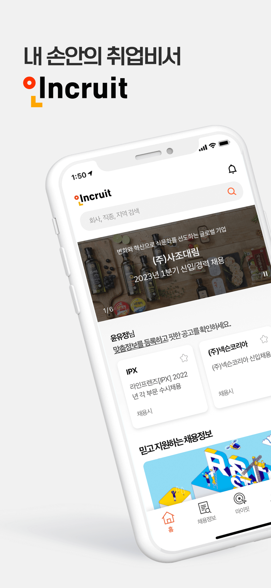 공고 확인부터 입사지원까지 인크루트 취업비서를 통해 구인구직 정보를 보두 확인하고 취업에 합격하시길 응원합니다.