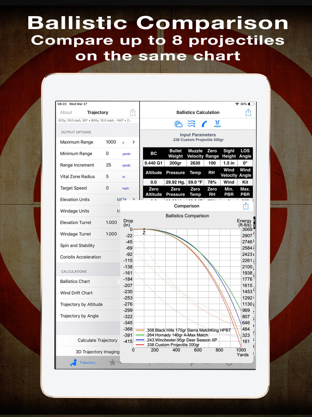 - Ballistic Charts: Display a chart of the current projectile including drop, energy, and velocity. Compare wind drift and up to eight projectiles on the same chart. Zoom charts up to 300% or save a full size chart to your photo album.