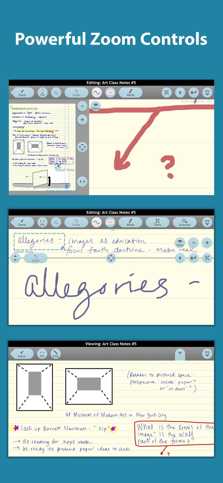 You can zoom in and out on a page using the pinch gesture while viewing or editing. The Zoomed Editing window lets you see both a zoomed-out overview and a zoomed-in close-up writing area at the same time.