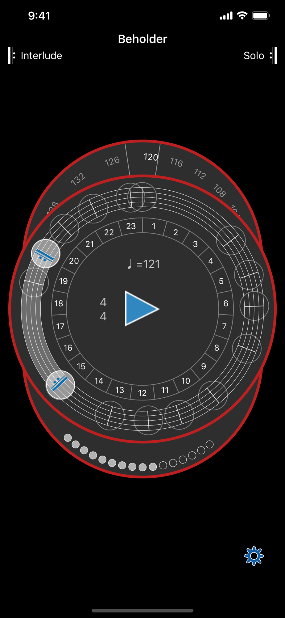 The unique graphical playback screen shows the current beat and the current repetition as segments of a circle. The number of the current beat is also shown in the center.
