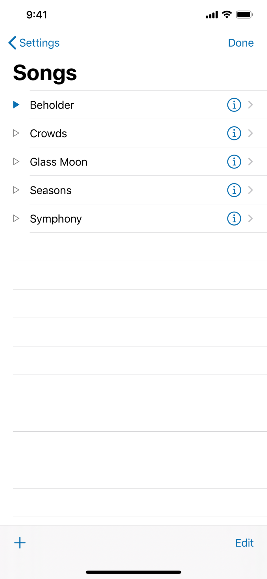 The Speed can be adjusted with the dial above the beat view. It ranges from 40 to 240 quarters per minute. Tapping in the middle starts and stops the playback. The volume is displayed below the beat view. Tapping on it shows the volume slider.