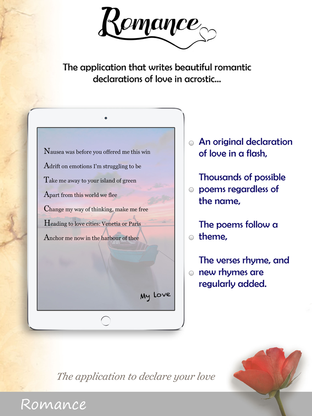 The application "Romance - The application to declare your love" writes, in an instant, for you, a pretty love poem that you can offer to the elect of your heart! Want another, on another topic? Your amazing device can compose a new one in a flash!