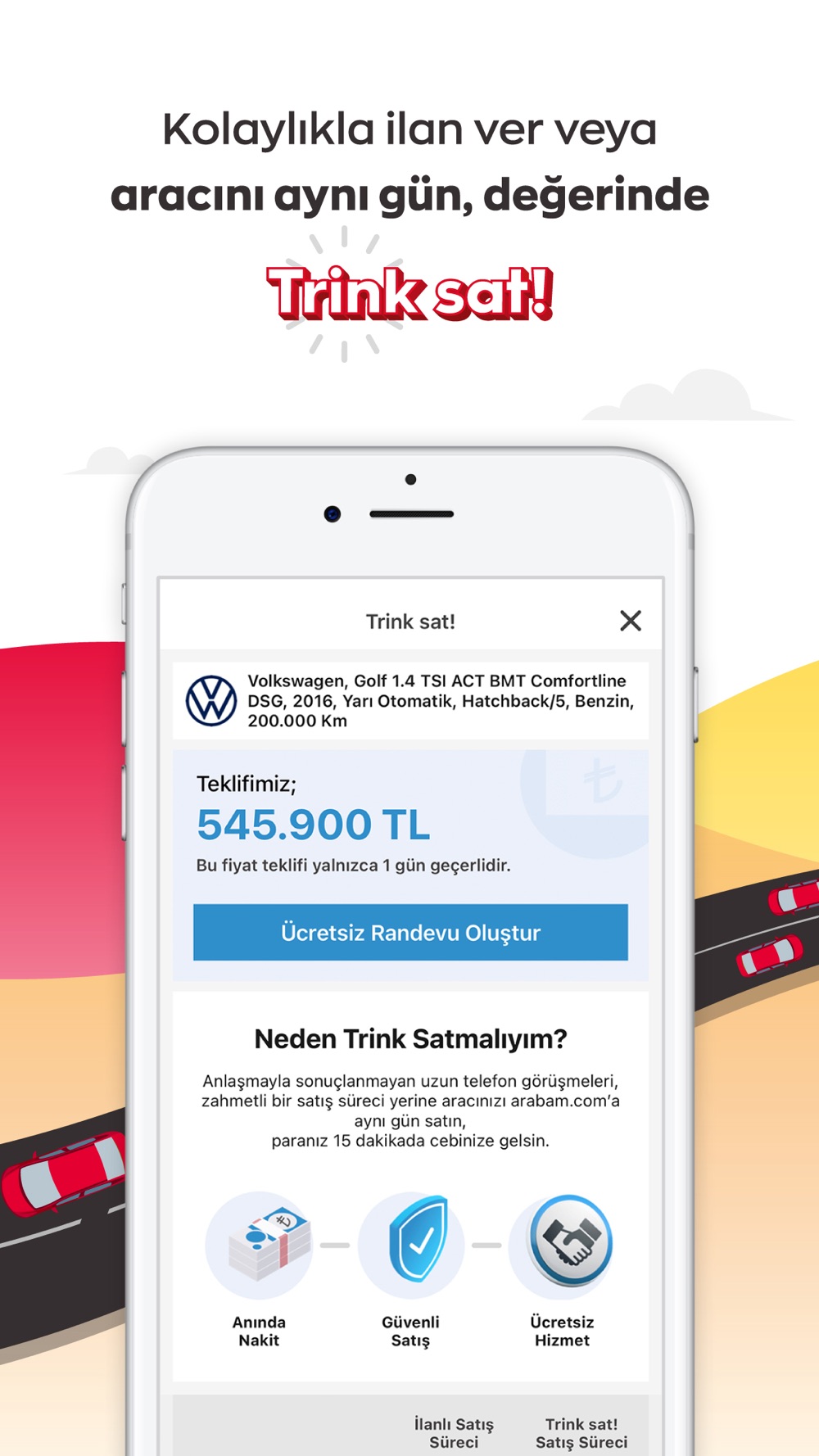 Arabam.com mobil uygulamasında bulunan Trink Sat! özelliği ile araç bilgilerinizi girerek ücretsiz fiyat teklifi alabilirsiniz. Eğer teklifi beğenirseniz, Trink satmak için ücretsiz olarak ekspertiz randevusu oluşturabilirsiniz. Son olarak da eğer aracınızın bilgilerini eksiksiz ve doğru bir şekilde yazdıysanız size verilen ilk fiyat teklifi ile aracınızı aynı gün içinde satabilirsiniz. Üstelik paranız 15 dakikada cebinizde!