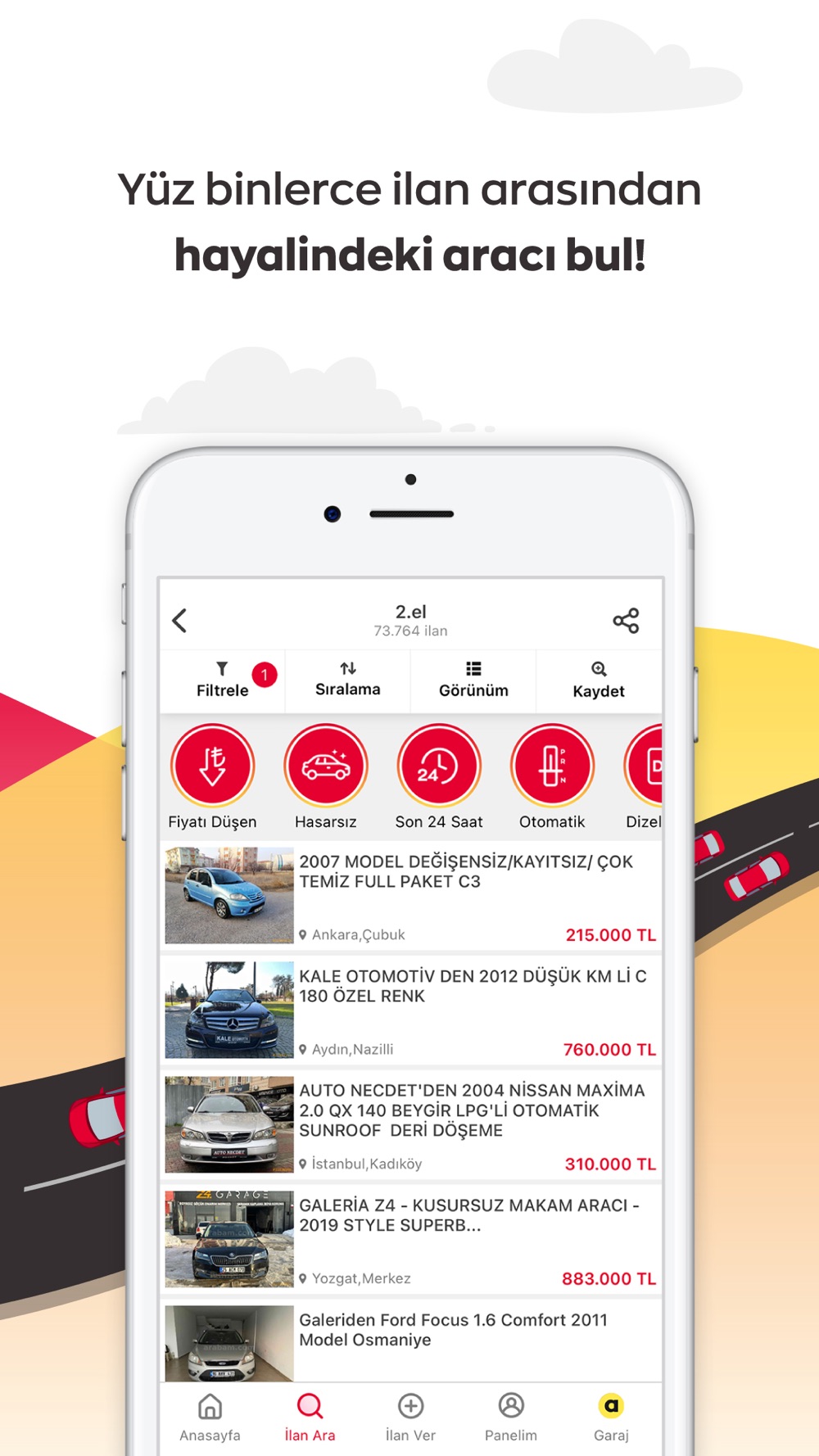 Araç fiyatları her geçen gün değişiyor. Beğendiğiniz ya da satın almak istediğiniz aracın fiyatını arabam.com mobil uygulaması ile ikinci el araç ilanlarına veya sıfır km araçların güncel fiyat, özellik ve kampanyalarına ulaşabilirsiniz. Galeriden veya sahibinden fark etmeksizin otomobil, ticari araç, arazi aracı, SUV, motosiklet, minivan, panelvan gibi tüm araç kategorileri içerisinde kolayca satılık araç ilanlarını inceleyebilir, favori arama kriterlerinizi oluşturabilir, beğendiğiniz araçları favorinize ekleyebilir ve hızlıca bu araçların sahiplerine ulaşabilirsiniz.